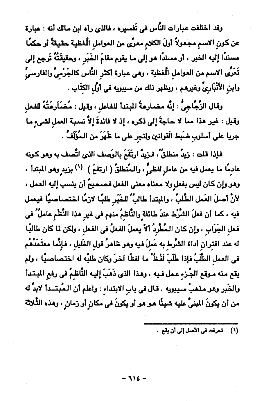 فإذا قلت: زيد منطلق، فزيد ارتفع بالوصف الذي اتصف به وهو كونه عادما ما يعمل فيه من عامل لفظي، والمنطلق (ارتفع) بزيد وهو المبتدأ، وهو وإن كان ليس بفعل ولا معناه معنى الفعل فصحيح أن ينسب إليه العمل، لأن أصل العمل الطلب، والمبتدأ طالب للخبر طلبا لازما اختصاصيا فيعمل فيه، كما أن فعل الشرط عند طائفة والناظم منهم في غير هذا النظم عامل في فعل الجواب، وإن كان المطرد ألا يعمل الفعل في الفعل، ولكن لما كان طالبا له عند اقتران أداة الشرط به عمل فيه وهو ظاهر قول الخليل، فإنما معتمدهم في العمل الطلب فإذا طلب لفظ ما لفظا آخر وكان طلبه له اختصاصيا، ولم يقع منه موقع الجزء عمل فيه، وهذا الذي ذهب إليه الناظم في رفع المبتدأ والخبر وهو مذهب سيبويه. قال في باب الابتداء: واعلم أن المبتدأ لابد له من أن يكون المبني عليه شيئا هو هو أو يكون في مكان أو زمان، وهذه الثلاثة