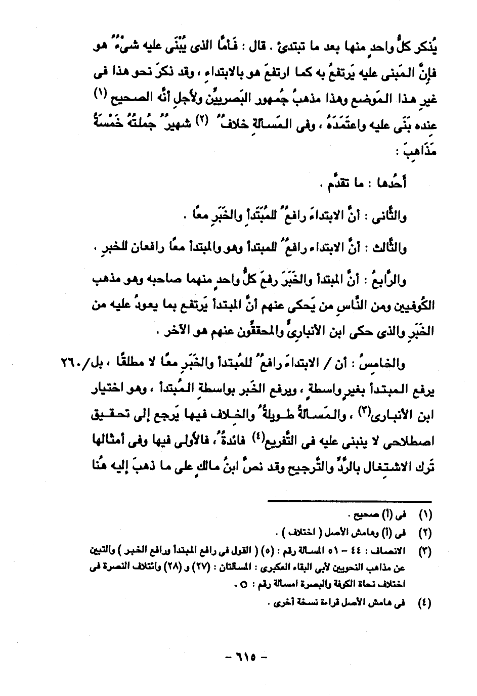 والرابع: أن المبتدأ والخبر رفع كل واحد منهما صاحبه وهو مذهب الكوفيين ومن الناس من يحكي عنهم أن المبتدأ يرتفع بما يعود عليه من الخبر والذي حكى ابن الأنباري والمحققون عنهم هو الآخر.
