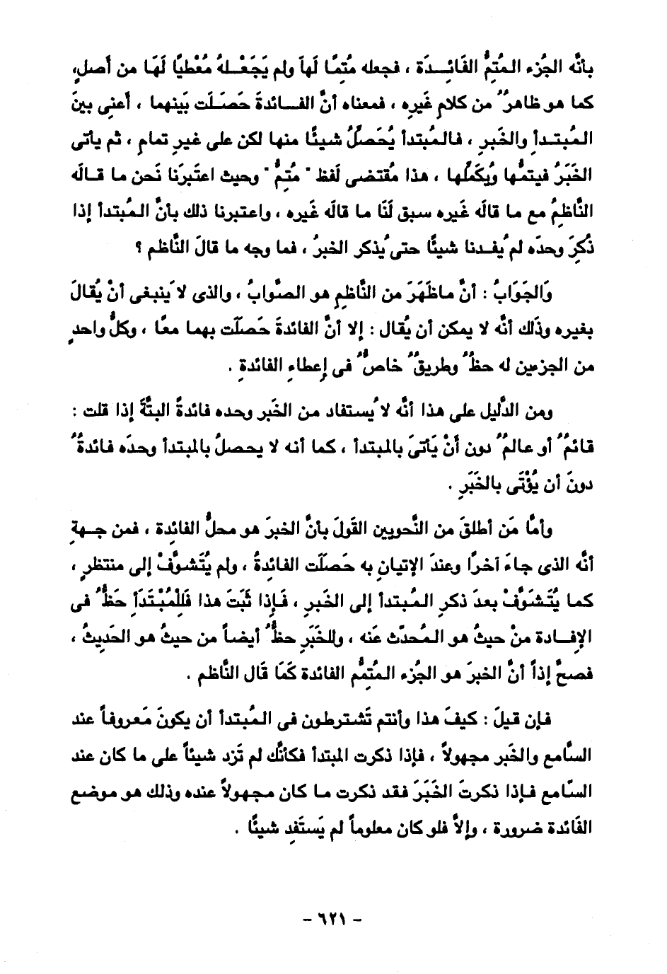 ومن الدليل على هذا أنه لا يستفاد من الخبر وحده فائدة البتة إذا قلت: قائم أو عالم دون أن يأتي بالمبتدأ، كما أنه لا يحصل بالمبتدأ وحده فائدة دون أن يؤتى بالخبر.