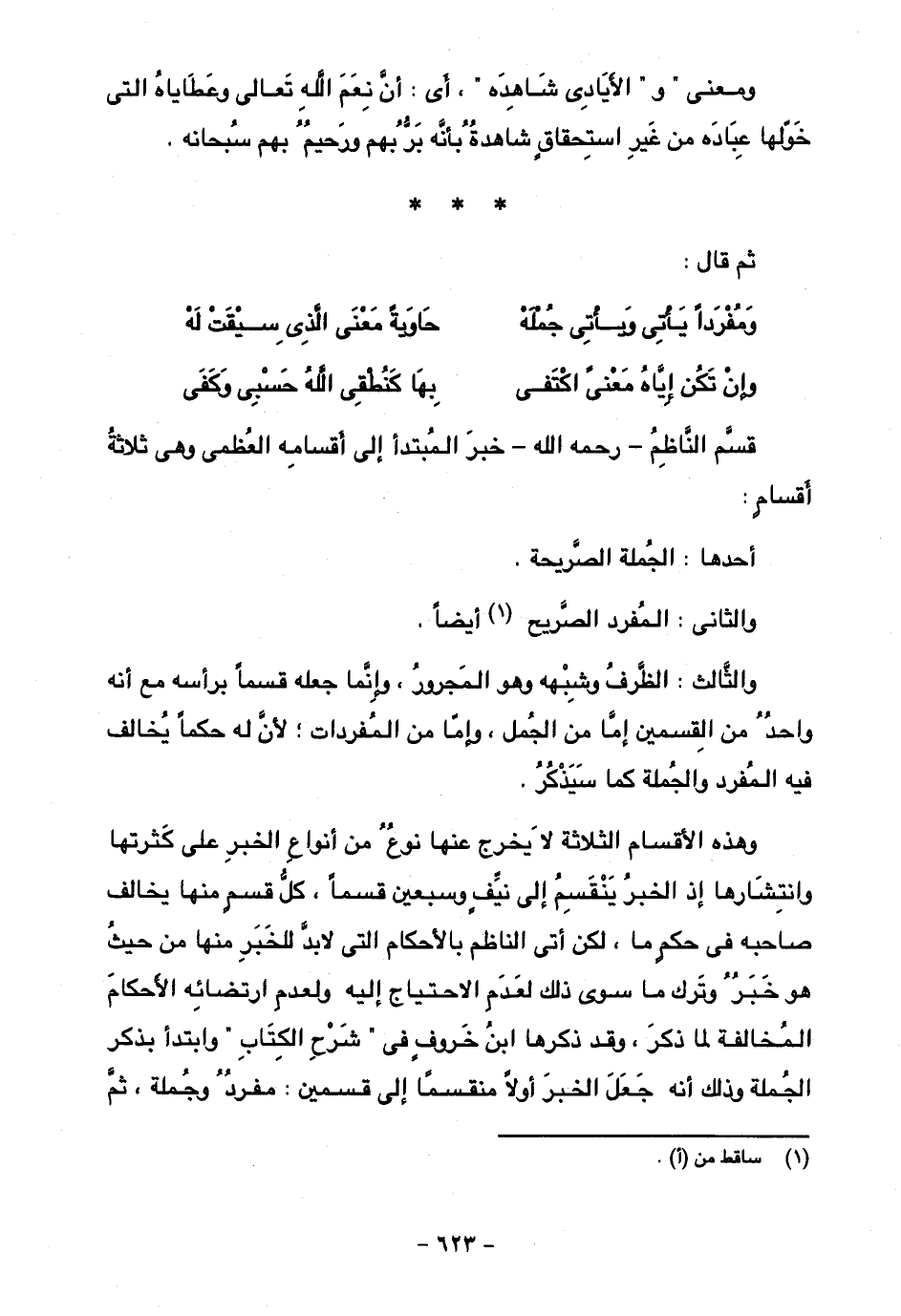 قسم الناظم- رحمه الله- خبر المبتدأ إلى أقسامه العظمى وهي ثلاثة أقسام: