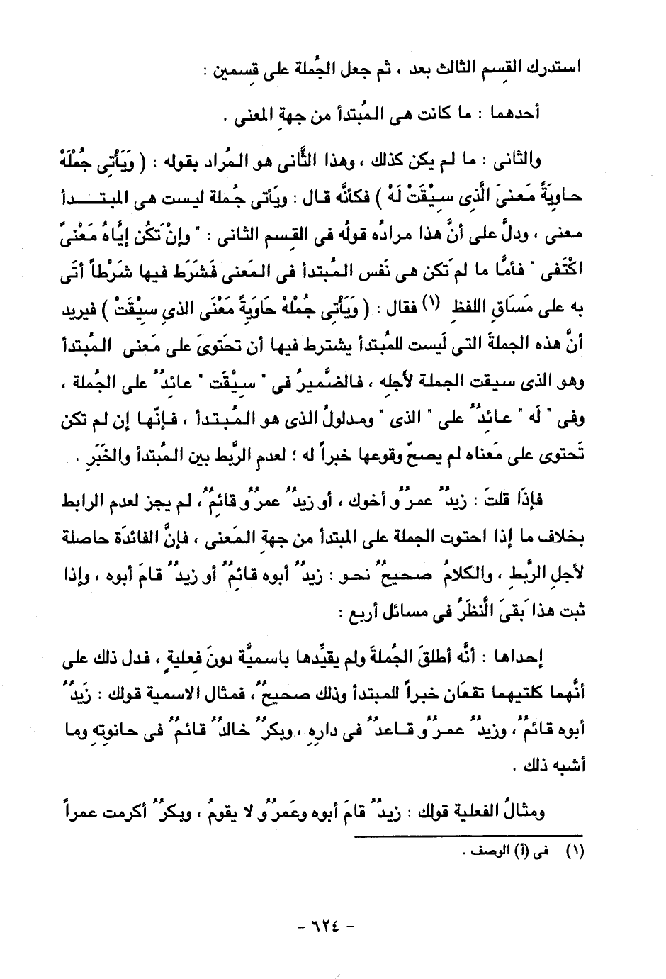 فإذا قلت: زيد عمر وأخوك، أو زيد عمر وقائم، لم يجز لعدم الرابط بخلاف ما إذا احتوت الجملة على المبتدأ من جهة المعنى، فإن الفائدة حاصلة لأجل الربط، والكلام صحيح نحو: زيد أبوه قائم أو زيد قام أبوه، وإذا ثبت هذا بقى النظر في مسائل أربع: