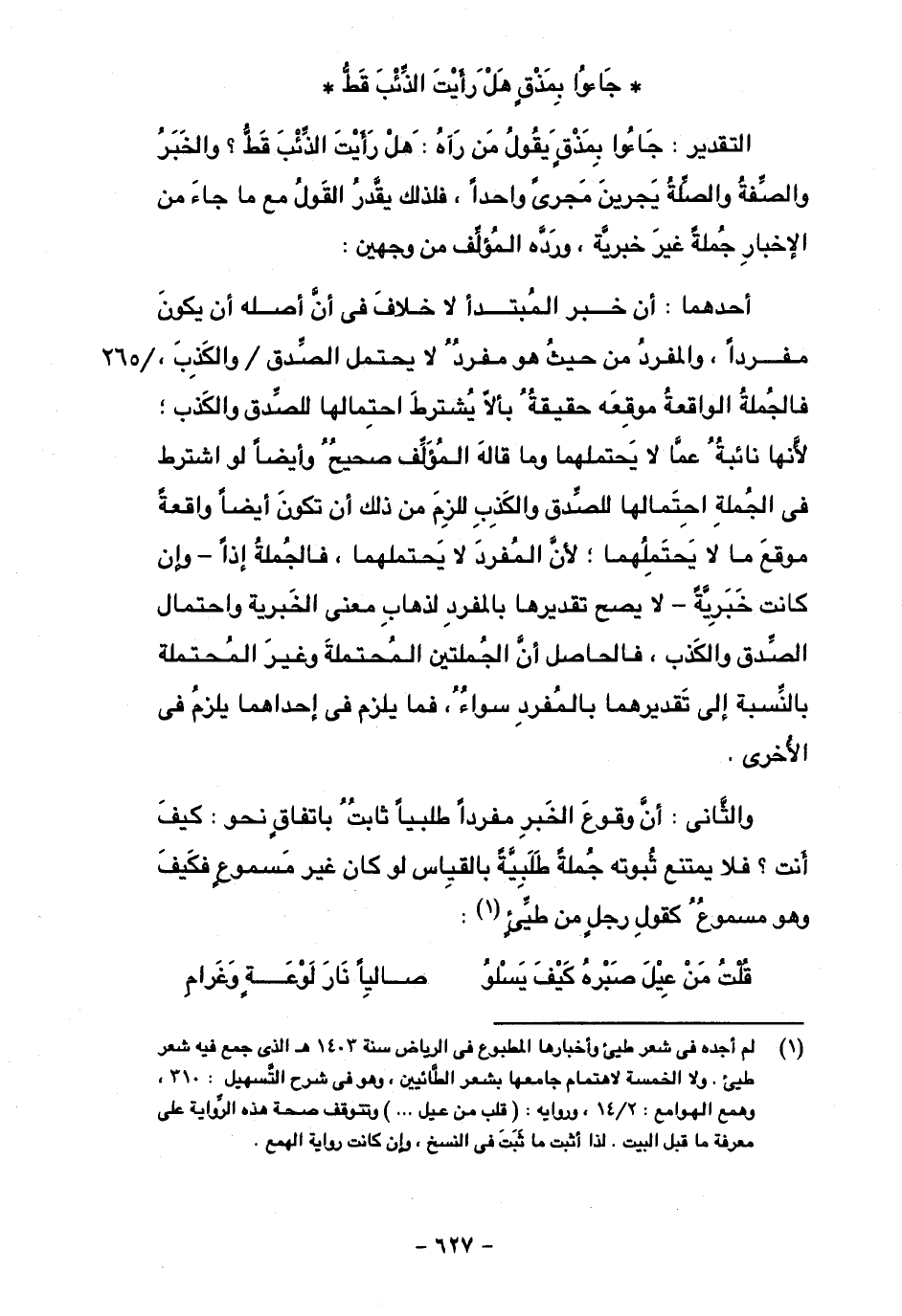 أحدهما: أن خبر المبتدأ لا خلاف في أن أصله أن يكون مفردا، والمفرد من حيث هو مفرد لا يحتمل الصدق/ والكذب، فالجملة الواقعة موقعه حقيقة بألا يشترط احتمالها للصدق والكذب؛ لأنها نائبة عما لا يحتملهما وما قاله المؤلف صحيح وأيضا لو اشترط في الجملة احتمالها للصدق والكذب للزم من ذلك أن تكون أيضا واقعة موقع ما لا يحتملهما؛ لأن المفرد لا يحتملهما، فالجملة إذا- وإن كانت خبرية- لا يصح تقديرها بالمفرد لذهاب معنى الخبرية واحتمال الصدق والكذب، فالحاصل أن الجملتين المحتملة وغير المحتملة بالنسبة إلى تقديرهما بالمفرد سواء، فما يلزم في إحداهما يلزم في الأخرى.