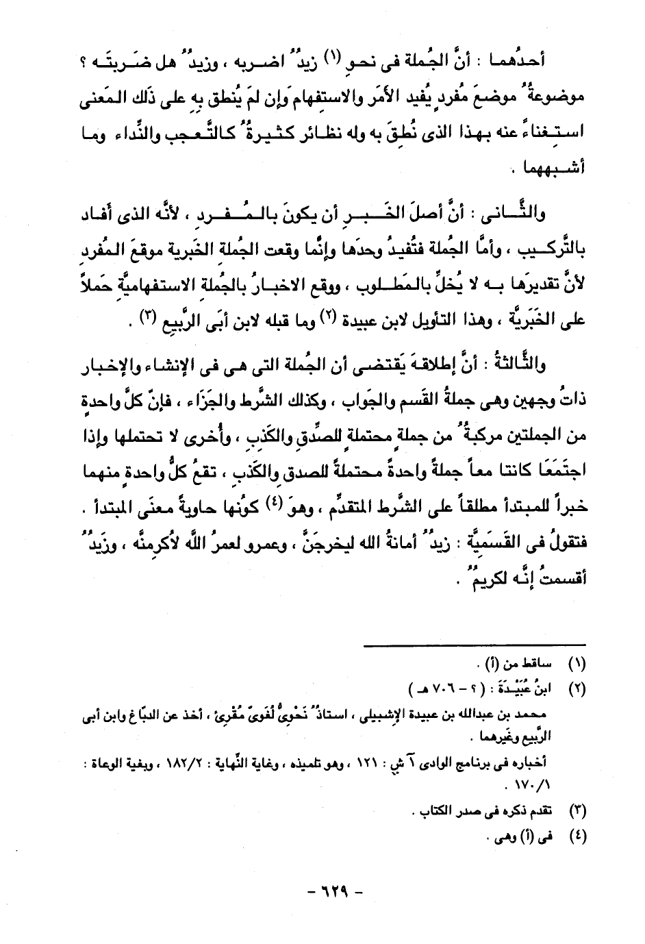 والثالثة: أن إطلاقه يقتضي أن الجملة التي هي في الإنشاء والإخبار ذات وجهين وهي جملة القسم والجواب، وكذلك الشرط والجزاء، فإن كل واحدة من الجملتين مركبة من جملة محتملة للصدق والكذب، وأخرى لا تحتملها وإذا اجتمعا كانتا معا جملة واحدة محتملة للصدق والكذب، تقع كل واحدة منهما خبرا للمبتدأ مطلقا على الشرط المتقدم، وهو كونها حايوة معنى المبتدأ. فتقول في القسمية: زيد أمانة الله ليخرجن، وعمرو لعمر الله لاكرمنه، وزيد أقسمت إنه لكريم.