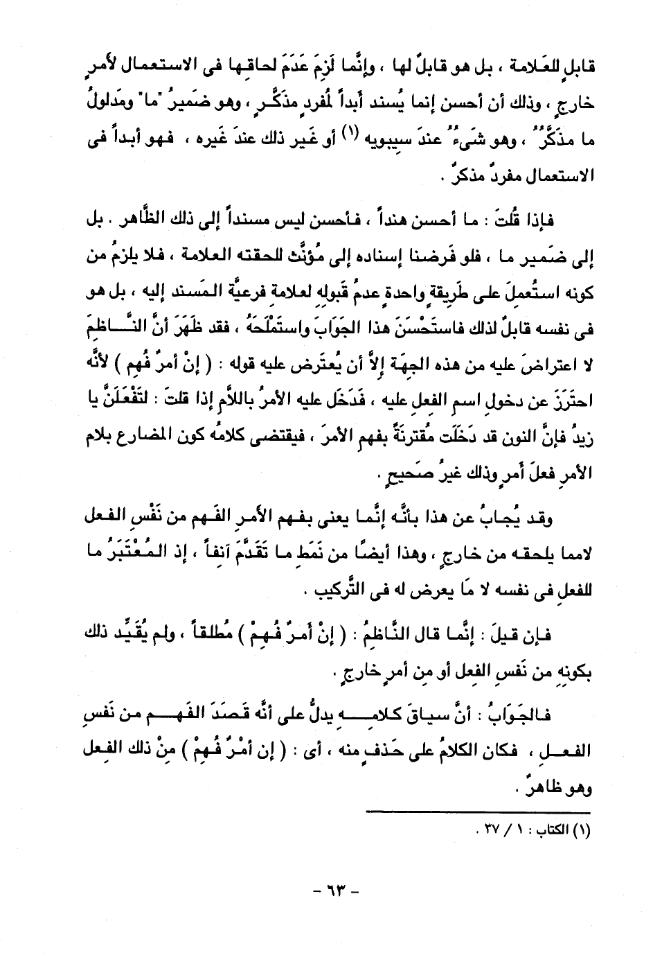 فإذا قلت: ما أحسن هندا، فأحسن ليس مسندا إلى ذلك الظاهر. بل إلى ضمير ما، فلو فرضنا إسناده إلى مؤنث للحقته العلامة، فلا يلزم من كونه استعمل على طريقة واحدة عدم قبوله لعلامة فرعية المسند إليه، بل هو في نفسه قابل لذلك فاستحسن هذا الجواب واستملحه، فقد ظهر أن الناظم لا اعتراض عليه من ذه الجهة إلا أن يعترض عليه قوله: (إن أمر فهم) لأنه احترز عن دخول اسم الفعل عليه، فخل عليه الأمر باللام إذا قلت: لتفعلن يا زيد فإن النون قد دخلت مقترنة بفهم الأمر، فيقتضي كلامه كون المضارع بلام الأمر فعل أمر وذلك غير صحيح.