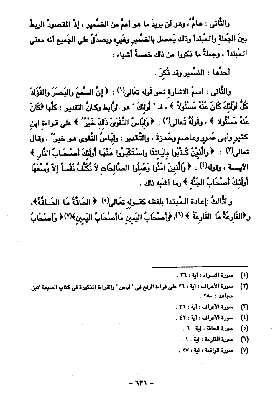 والثاني: اسم الإشارة نحو قوله تعالى: {إن السمع والبصر والفؤاد كل أولئك كان عنه مسئولا}، "أولئك" هو الرباط وكأن التقدير: كلها {كان عنه مسئولا}، وقوله تعالى: {ولباس التقوى ذلك خير} على قراءة ابن كثير وأبي عمرو وعاصم وحمزة، والتقدير: ولباس التقوى هو خير. وقال تعالى: {والذين كذبوا بآياتنا واستكبروا عنها أولئك أصحاب النار} الآية، وقوله: {والذين آمنوا وعملوا الصالحات لا نكلف نفسا إلا وسعها أولئك أصحاب الجنة} وما أشبه ذلك.