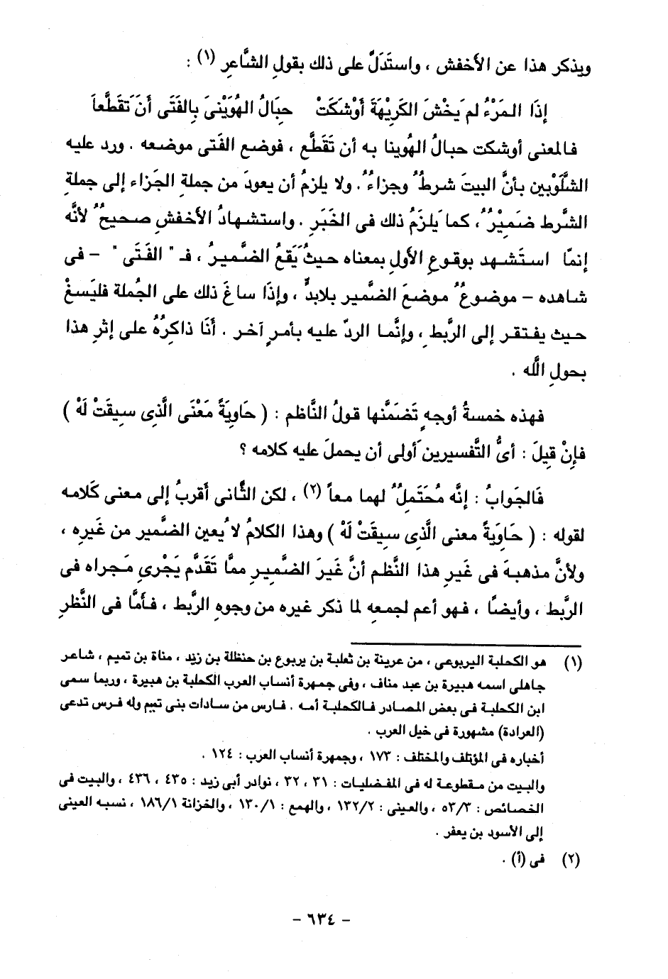 فالمعنى أوشكت حبال الهوينا به أن تقطع، فوضع الفتى موضعه. ورد عليه الشلوبين بأن البيت شرط وجزاء. ولا يلزم أن يعود من جملة الجزاء إلى جملة الشرط ضمير، كما يلزم ذلك في الخبر. واستشهاد الأخفش صحيح لأنه إنما استشهد بوقوع الأول بمعناه حيث يقع الضمير، فـ "الفتى"- في شاهده- موضوع موضع الضمير بلابد، وإذا ساغ ذلك على الجملة فليسغ حيث يفتقر إلى الربط، وإنما الرد عليه بأمر آخر. أنا ذاكره على إثر هذا بحول الله.