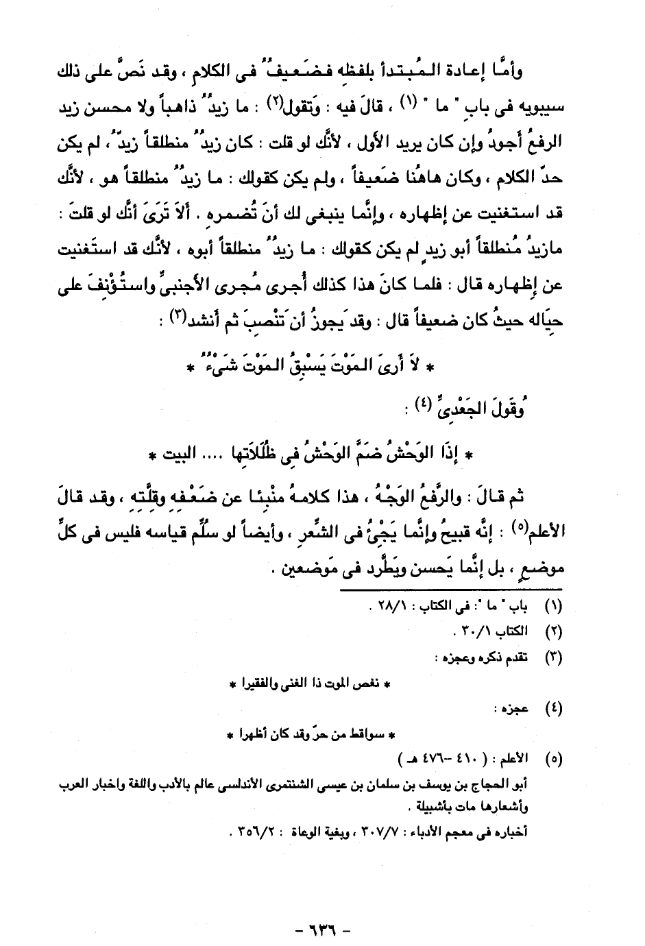 وأما إعادة المبتدأ بلفظه فضعيف في الكلام، وقد نص على ذلك سيبويه في باب "ما"، قال فيه: وتقول: ما زيد ذاهبا ولا محسن زيد الرفع أجود وإن كان يريد الأول، لأنك لو قلت: كان زيد منطلقا زيد، لم يكن حد الكلام، وكان هاهنا ضعيفا، ولم يكن كقولك: ما زيد منطلقا هو، لأنك قد استغنيت عن إظهاره، وإنما ينبغي لك أن تضمره. ألا ترى أنك لو قلت: ما زيد منطلقا أبو زيد لم يكن كقولك: ما زيد منطلقا أبوه، لأنك قد استغنيت عن إظهاره قال: فلما كان هذا كذلك أجرى مجرى الأجنبي واستؤنف على حياله حيث كان ضعيفا قال: وقد يجوز أن تنصب ثم أنشد: