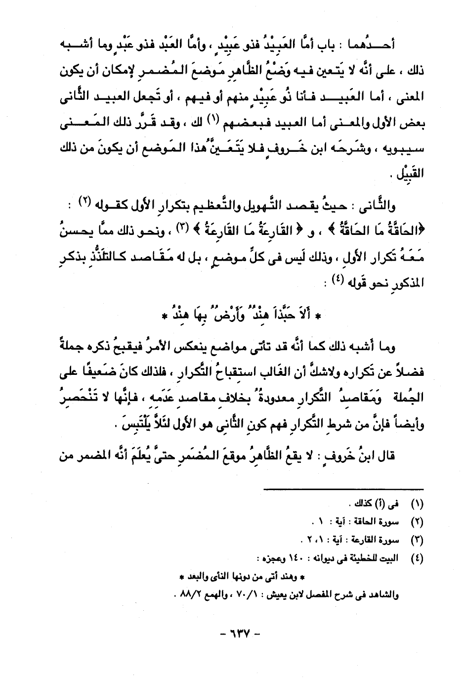 والثاني: حيث يقصد التهويل والتعظيم بتكرار الأول كقوله: {الحاقة ما الحاقة}، و {القارعة ما القارعة}، ونحو ذلك مما يحسن معه تكرار الأول، وذلك ليس في كل موضع، بل له مقاصد التلذذ بذكر المذكور نحو قوله: