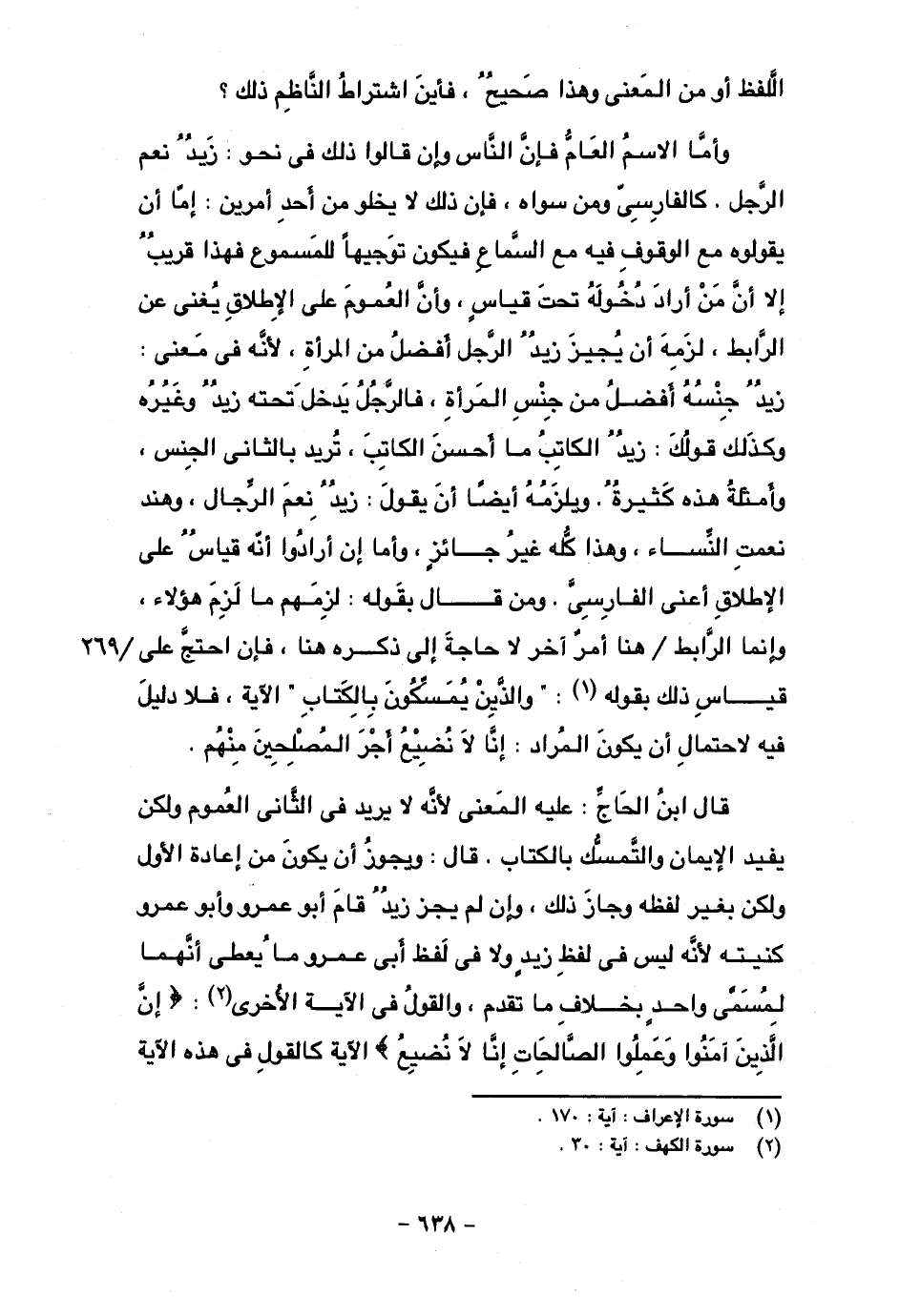 وأما الاسم العام فإن الناس وإن قالوا ذلك في نحو: زيد نعم الرجل، كالفارسي ومن سواه، فإن ذلك لا يخلو من أحد أمرين: إما أن يقولوه مع الوقوف فيه مع السماع فيكون توجيها للمسموع فهذا قريب إلا أن من أراد دخوله تحت قياس، وأن العموم على الإطلاق يغني عن الرابط، لزمه أن يجيز زيد الرجل أفضل من المرأة، لأنه في معنى: زيد جنسه أفضل من جنس المرأة، فالرجل يدخل تحته زيد وغيره، وكذلك قولك: زيد الكاتب ما أحسن الكاتب، تريد بالثاني الجنس، وأمثلة هذه كثيرة. ويلزمه أيضا أن يقول: زيد نعم الرجال، وهند نعمت النساء، وهذا كله غير جائز، وأما إن أرادوا أنه قياس على الإطلاق أعني الفارسي. ومن قال بقوله: لزمهم ما لزم هؤلاء، وإنما الرابط/ هنا أمر آخر لا حاجة إلى ذكره هنا، فإن احتج على قياس ذلك بقوله: "والذين يمسكون بالكتاب" الآية، فلا دليل فيه لاحتمال أن يكون المراد: إنا لا نضيع اجر المصلحين منهم.