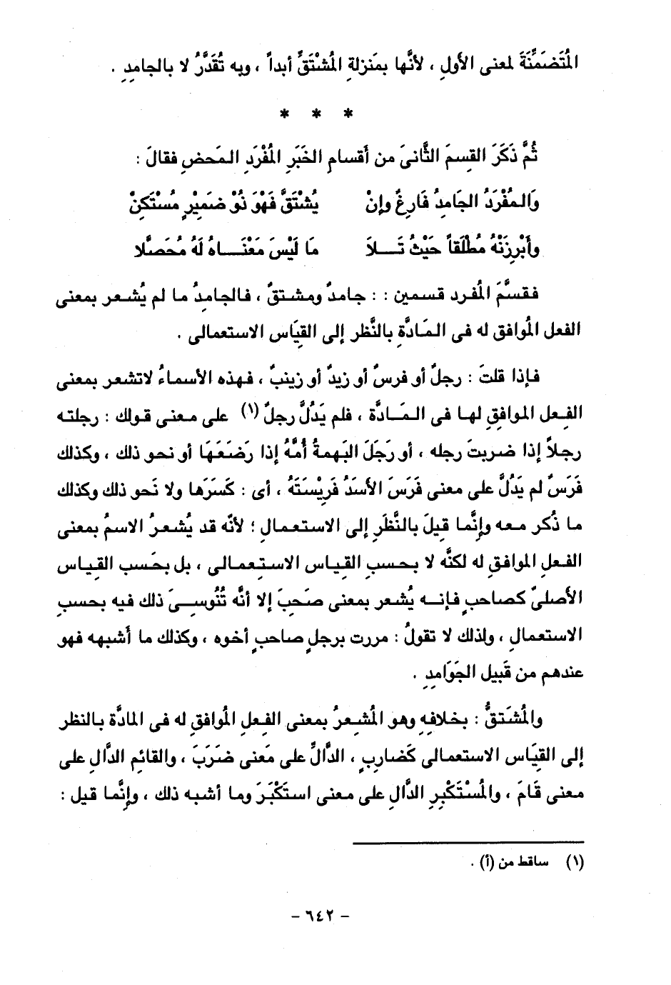 فقسم المفرد قسمين: جامد ومشتق، فالجامد ما لم يشعر بمعنى الفعل الموافق له في المادة بالنظر إلى القياس الاستعمالي.