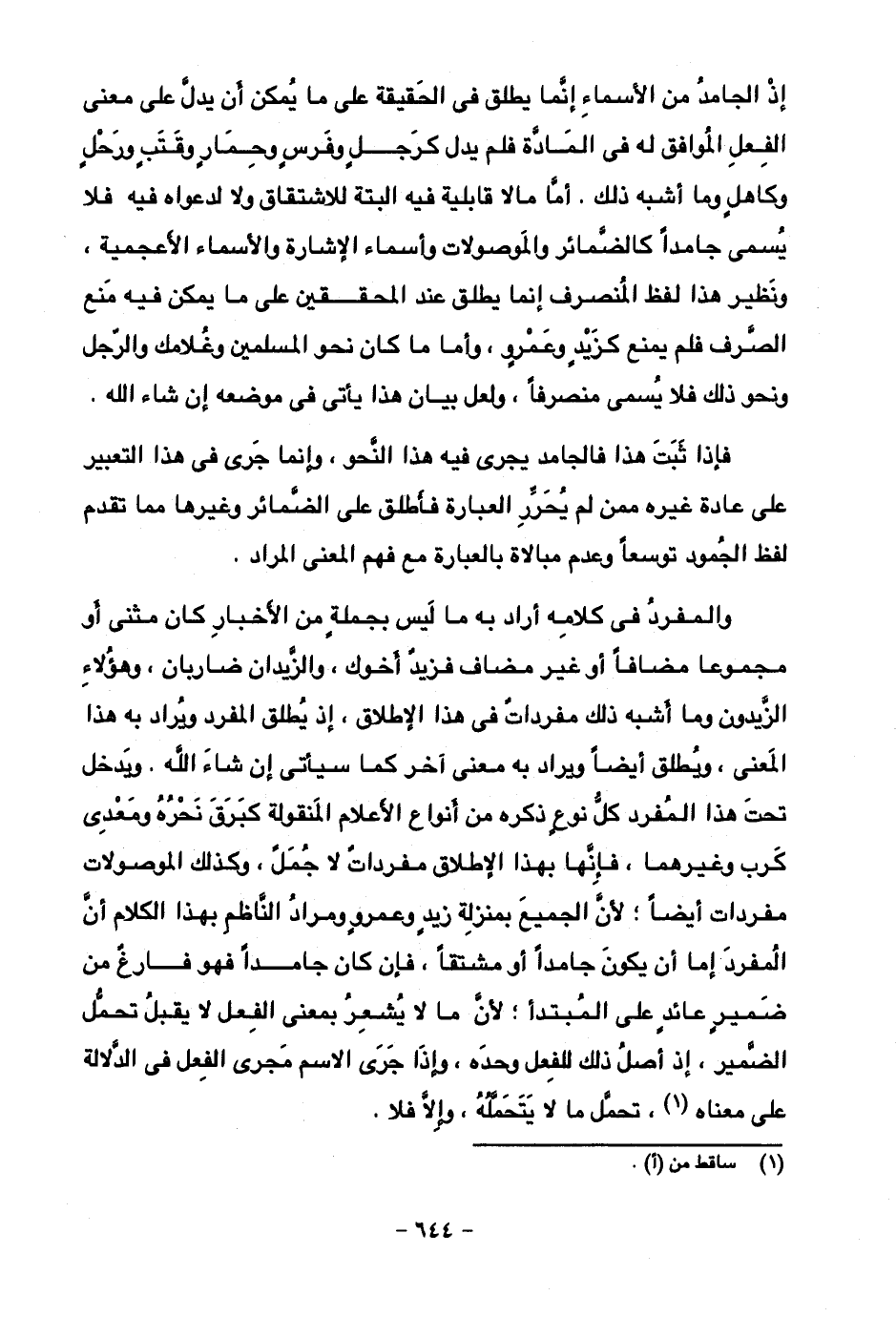 إذ الجامد من الأسماء إنما يطلق في الحقيقة على ما يمكن أن يدل على معنى الفعل الموافق له في المادة فلم يدل كرجل وفرس وحمار وقتب ورحل وكاهل وما أشبه ذلك. أما ما لا قابلية فيه البتة للاشتقاق ولا لدعواه فيه فلا يسمى جامدا كالضمائر والموصولات وأسماء الإشارة والأسماء الأعجمية، ونظير هذا لفظ المنصرف إنما يطلق عند المحققين على ما يمكن فيه منع الصرف فلم يمنع كزيد وعمرو، وأما ما كان نحو المسلمين وغلامك والرجل ونحو ذلك فلا يسمى منصرفا، ولعل بيان هذا يأتي في موضعه إن شاء الله.
