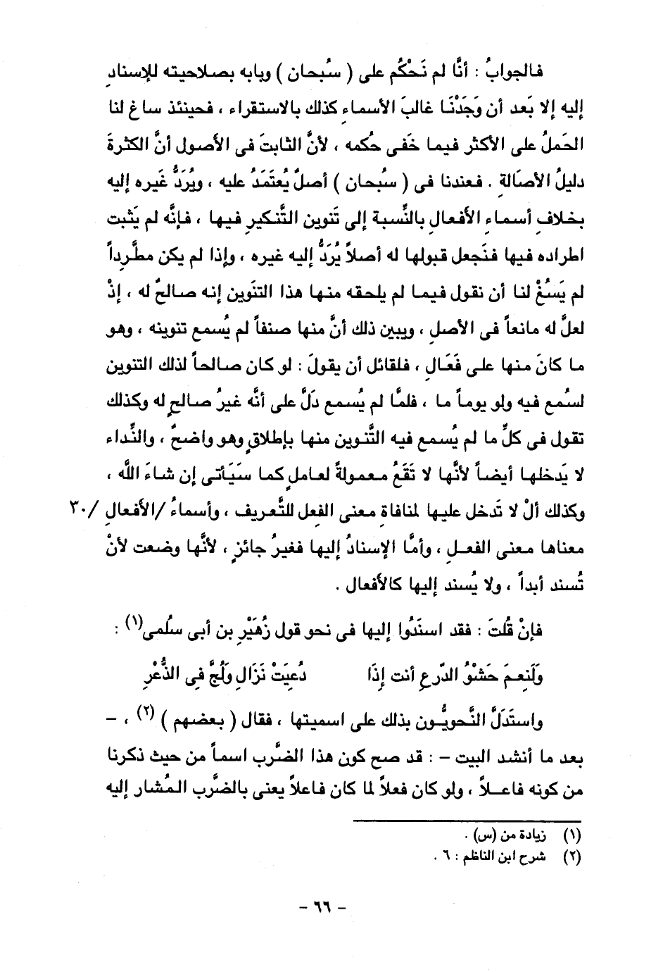 فالجواب: أنّا لم نحكم على (سبحان) وبابه بصلاحيته للإسناد إليه إلا بعد أن وجدنا غالب الأسماء كذلك بالاستقراء، فحينئذ ساغ لنا الحمل على الأكثر فيما خفي حكمه، لأن الثابت في الأصول أن الكثرة دليل الأصالة، فعندنا في (سبحان) أصل يعتمد عليه، ويرد غيره إليه بخلاف أسماء الأفعال بالنسبة إلى التنوين إنه صالح له، إذ لعل له مانعا في الأصل، ويبين ذلك أن منها صنفا لم يُسمع تنوينه، وهو ما كان منها على فَعَالِ، فلقائل أن يقول: لو كان صالحا لذلك التنوين أسمع فيه ولو يوما ما، فلما لم يُسمع فيه التنوين منها بإطلاق وهو واضح، والنداء لا يدخلها أيضا لأنها لا تقع معمولة لعامل كما سيأتي إن شاء الله، وكذلك أل لا تدخل لمنافاة معنى الفعل للتعريف، وأسماء الأفعال معناها معنى الفعل، وأما الإسناد إليها فغير جائز، لنها وضعت لأن تُسند أبدا إليها كالأفعال.