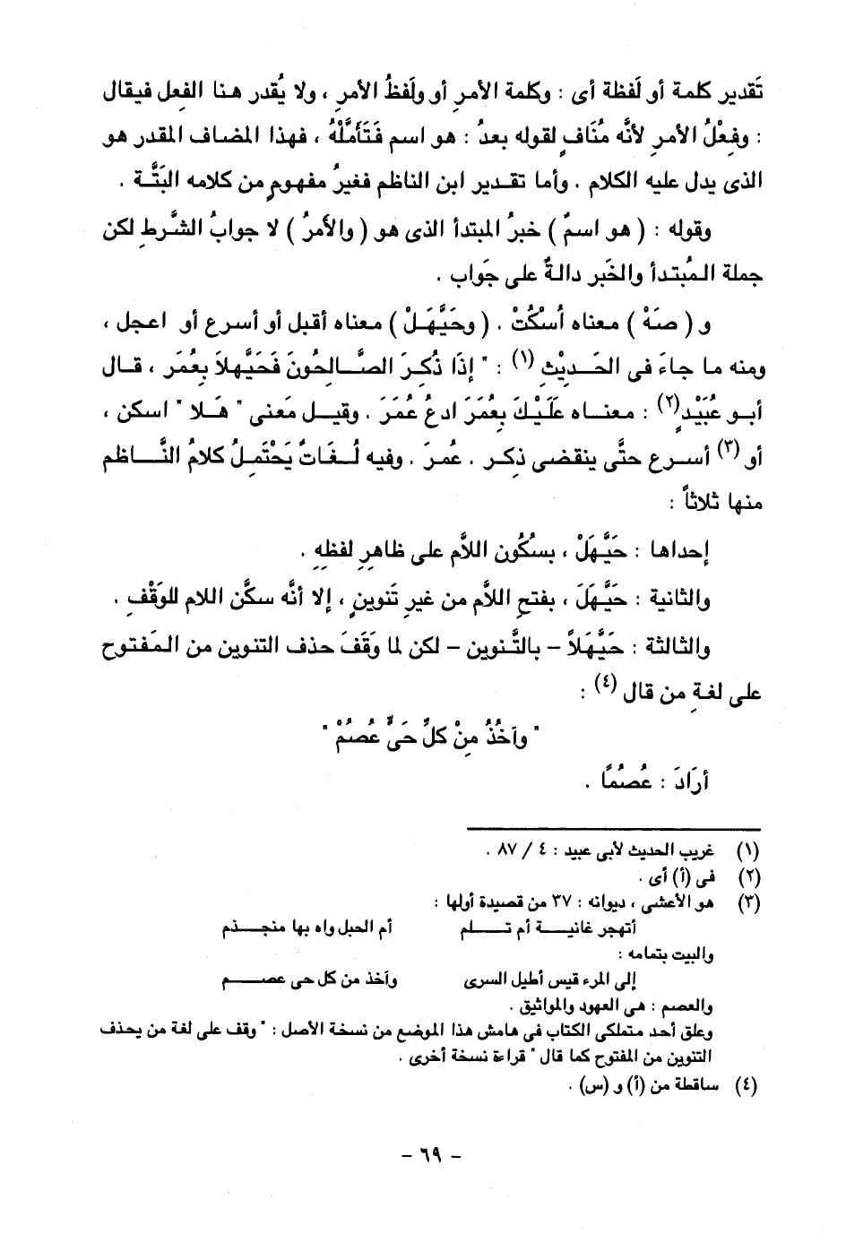 و(صه) معناه أسكت. (وحيهل) معناه أقبل أو أسرع أو اعجل، ومنه جاء في الحديث: "إذا ذكر الصالحون فحيهلا بعمر، قال أبو عبيد: معناه عليك بعمر ادع عمر. وقيل معنى "هلا" اسكن، أو أسرع حتى ينقضي ذكر. عمرُ. وفيه لغات يحتمل كلام الناظم منها ثلاثا: