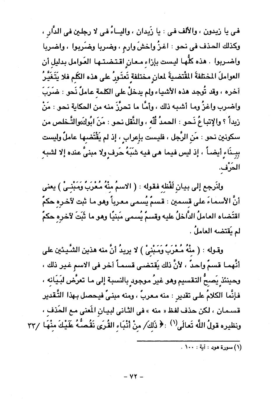 في يا زيدون، والألف في يا زيدان، والياء في لا رجلين في الدار، وكذلك الحذف في نحو: اغزُ واخش وارم، وضربا واضربوا، واضربا واضربوا، هذه كلها ليست بإزاء معان اقتضتها العوامل بدليل أن العوامل المختلفة المقتضية لمعان مختلفة تَعتَوِرُ على هذه الكلم فلا يتغير آخره، وقد توجد هذه الأشياء ولم يدخل على الكلمة عامل نحو: ضرب واضرب واغزُ وما أشبه ذلك، وأما ما تحرز منه من الحكاية نحو: من زيدا؟ والإتباع نحو: الحمد لله، والنقل نحو: من أبوك، والتخلص من سكونين نحو: من الرجل، فليست بإعراب، إذ لم يقتضها عامل وليست ببناء أيضا، إذ ليس فيما هي فيه شبه حرف ولا مبنى عنده إلا لشبه الحرف.