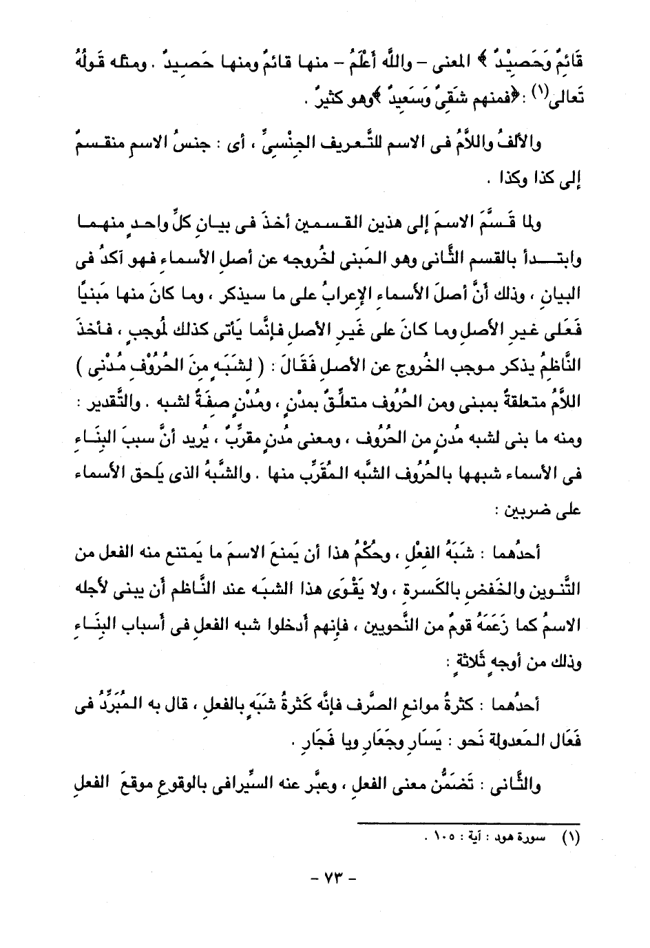 أحدهما: شبه الفعل، وحكم هذا أن يمنع الاسم ما يمتنع منه الفعل من التنوين والخفض بالكسرة، ولا يقوي هذا الشبه عند الناظم أن يبني لأجله الاسم كما زعمه قوم من النحويين، فإنهم أدخلوا شبه الفعل في أسباب البناء وذلك من أوجه ثلاثة: