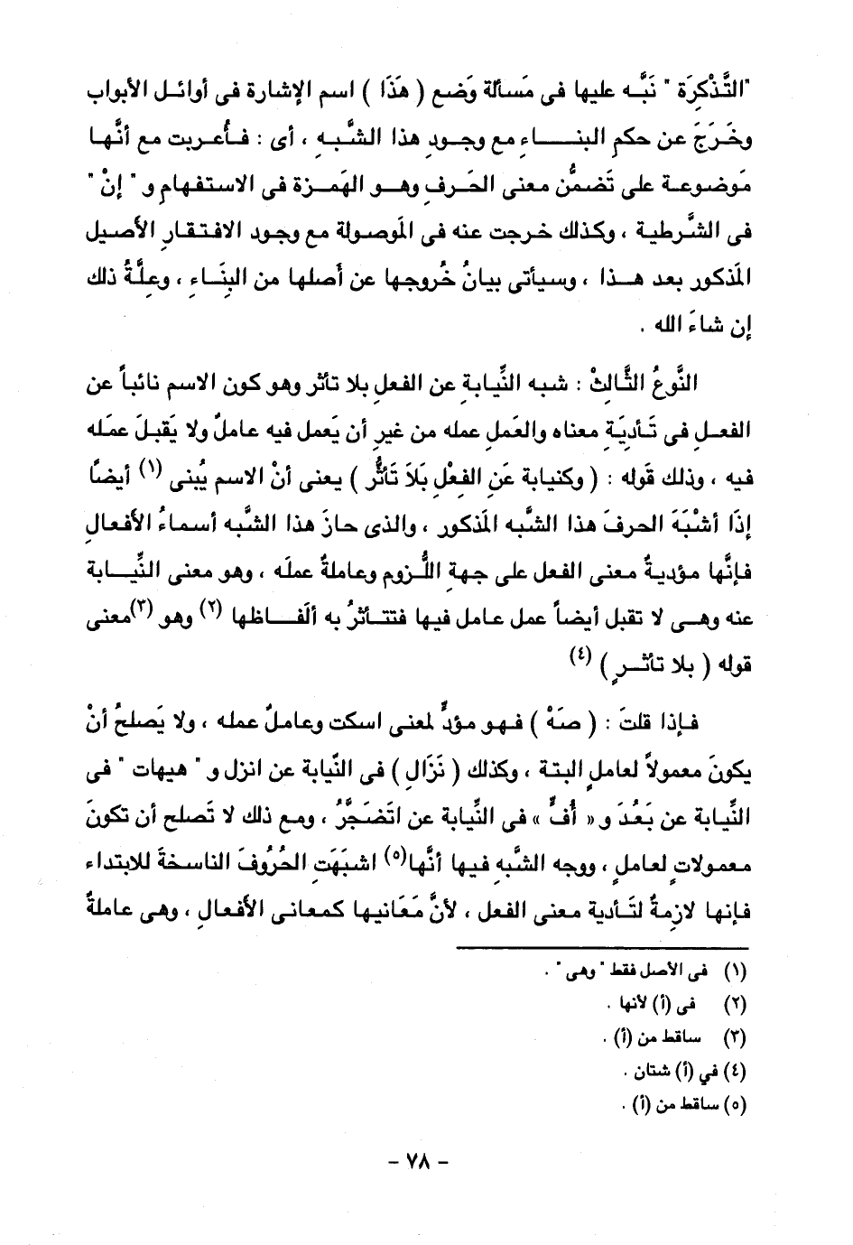 فإذا قلت: (صه) فهو مؤد لمعنى اسكت وعامل عمله، ولا يصلح أن يكون معمولا لعامل البتة، وكذلك (نزال) في النيابة عن انزل و "هيهات" في النيابة عن بعد و "أف" في النيابة عن اتضجر، ومع ذلك لا تصلح أن تكون معمولات لعام، ووجه الشبه فيها أنها اشبهت الحروف الناسخة للابتداء فإنها لازمة لتأدية معنى الفعل، لأن معانيها كمعاني الأفعال، وهي عاملة