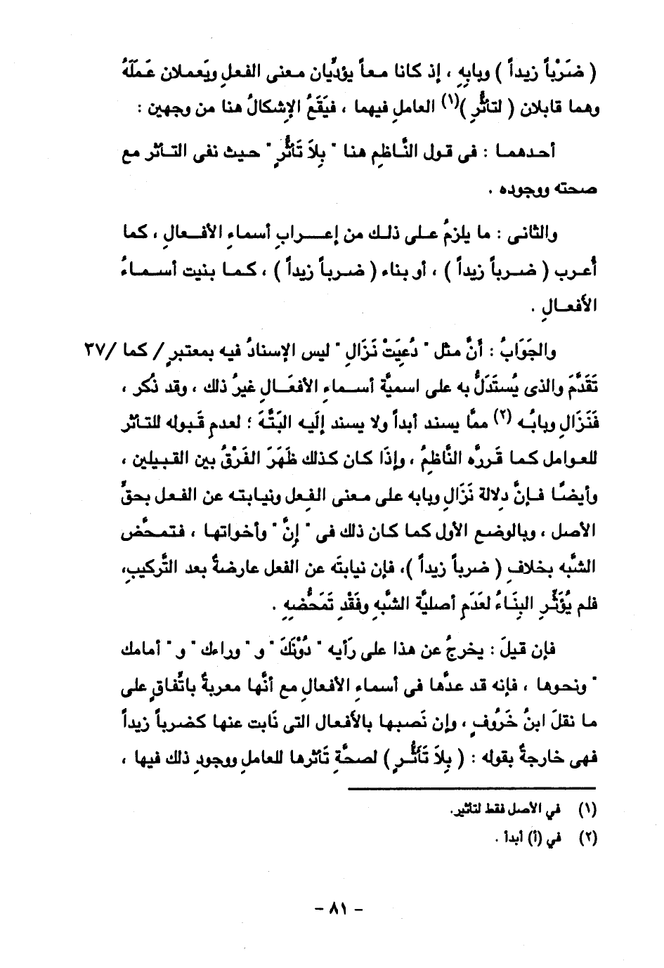 (ضرباً زيدا) وبابه، إذ كانا معا يؤديان معنى الفعل ويعملان عمله وهما قبلان (لتأثر) العامل فيهما، فيقع الإشكال هنا من وجهين: