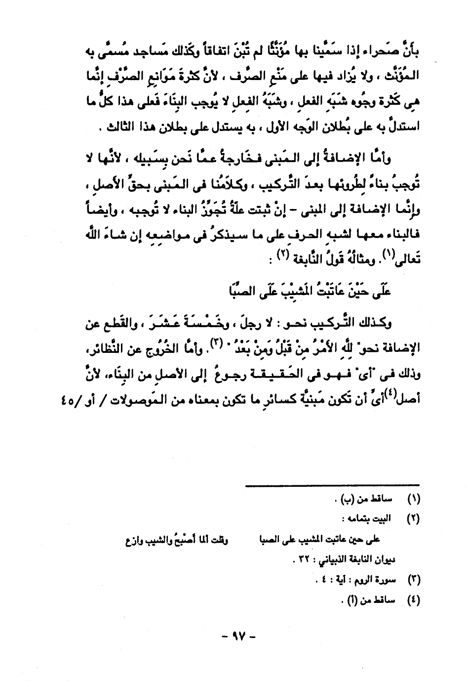 وأما الإضافة إلى المبنى فخارجة عما نحن بسبيله، لأنها لا توجب بناء لطروئها بعد التركيب، وكلامنا في المبنى بحق الأصل، وإنما الإضافة إلى البنى -إن ثبت علة تجوز البناء لا توجبه، وأيضا فالبناء معها لشبه الحرف على ما سيذكر في مواضعه إن شاء الله تعالى. ومثاله قول النابغة: