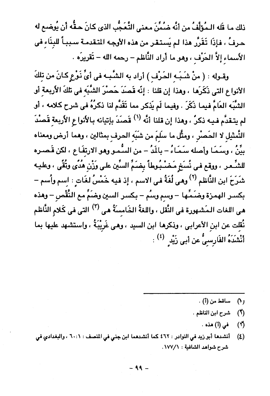 وقوله: (من شبه الحرف) أراد به الشبه في أي نوع كان من تلك الأنواع التي ذكرها، وهذا إن قلنا: إنه قصد حصر الشبه في تلك الأربعة أو الشبه العام فيما ذكر، وفيما لم يذكر مما تقدم لنا ذكره في شرح كلامه، أو لم يتقدم فيه ذكر، وهذا إن قلنا أنه قصد بإتيانه بالأنواع الأربعة قصد التمثيل لا الحصر، ومثل ما سلم من شبه الحرف بمثالين، وهما أرض ومعناه بيّن، وسما وأصله سماء -بالمد- من السمو وهو الارتفاع، لكن قصره للشعر، ووقع في نسخ مضبوطا بضم السين على وزن هُدى وتُقى، وعليه شرح ابن الناظم وهي لغة في الاسم، إذ فيه خمس لغات: اِسم واُسم -بكسر الهمزة وضميها- وسِم وشُم -بكسر السين وضم مع النقص- وهذه هي اللغات المشهورة في النقل، واللغة الخامسة هي التي في كلام الناظم نقلت عن ابن الأعرابي، وذكرها ابن السيد، وهي غريبة، واستشهد عليها بما أنشده الفارسي عن أبي زيد: