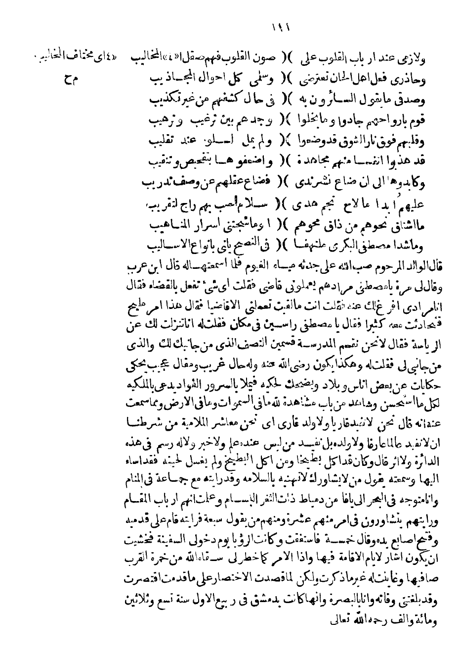 قال الوالد المرحوم صب الله على جدثه مياه الغيوم فلما اسمعتها له قال ابن عرب وقال لي مرة يا مصطفى مرادهم يعملوني قاضي فقلت أي شيء تفعل بالقضاء فقال انا مرادي افرغ لك عنه فقلت أنت ما لقيت تعملني الاقاضيا فقال هذا أمر مليح فتحادثت معه كثيراً فقال يا مصطفى راسين في مكان فقلت له انا تنزلت لك عن الرياسة فقال لا نحن نقسم المدرسة قسمين النصف الذي من جانبك لك والذي من جانبي لي فقلت له وهكذا يكون رضي الله عنه وله حال غريب ومقال عجيب يحكي حكايات عن بعض اناس وبلاد ويضحك لحكيه فيملا بالسرور الفؤاد يدعي بالملكيه لكل ما استحسن وشاهد من باب مشاهدة لله ما في السموات وما في الارض ومما سمعت عنه انه قال نحن لا نفيد قارياً ولا ولد قاري أي نحن معاشر الملامية من شرطنا ان لا نفيد عالماً عارفاً ولا ولده بل نفيد من ليس عنده علم ولا خبر ولا له رسم في هذه الدائرة ولا أثر قال وكان قد أكل بطيخاً ومن أكل البطيخ ولم يغسل لحينه فقد أساء اليها وسمعته يقول من لا يشأورك لا تهنيه بالسلامة وقد رأيته مع جماعة في المنام وانا متوجه في البحر إلى يافا من دمياط ذات الثغر البسام وعلمت انهم ارباب المقام ورأيتهم يتشأورون في امر منهم عشرة ومنهم من يقول سبعة فرأيته قام على قدميه وفتح اصابع يده وقال خمسة فاستفقت وكأنت الرؤيا يوم دخولي السفينة فخشيت ان يكون أشار لايام الاقامة فيها وإذا الامر كما خطر لي سقاه الله من خمرة القرب صافيها وغاينت له غير ما ذكرت ولكن لما قصدت الاختصار على ما قدمت اقتصرت وقد بلغتني وفاته وانا بالبصرة وانها كأنت بدمشق في ربيع الأول سنة تسع وثلاثين ومائة والف رحمه الله تعالى.