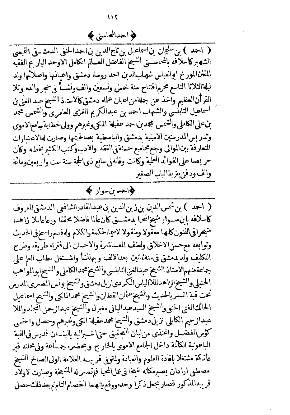 أحمد بن سليمان بن إسماعيل بن تاج الدين بن أحمد الحنفي الدمشقي التميمي الشهير كأسلافه بالمحاسني الشيخ الفاضل العالم الكامل الأوحد البارع الفقيه المفتن المؤرخ ابو العباس شهاب الدين أحد رؤساء دمشق واعيانها واصلائها ولد ليلة الثلاثاء التاسع محرم افتتاح سنة خمس وتسعين وألف ونشأ في حجر والده وتلا القرآن العظيم واخذ عن جملة من أعيان علماء دمشق كالاستاذ الشيخ عبد الغني بن إسماعيل النابلسي والشهاب أحمد بن عبد الكريم الغزي العامري والشمس محمد بن علي الكاملي والشمس محمد بن أحمد عقيلة المكي وغيرهم وولي خطابة جامع الاموي وتدريس المدرستين الامينية بدمشق والباسطية بصالحيتها وصارت له الاعتبارات المتعارفة بين الموالي وجمع مجاميع حسنة في الفقه والادب وكتب الكثير بخطه وكان حريصاً على الفوائد العلمية وكأنت وفاته في سابع ذي الحجة سنة ست وأربعين ومائة والف ودفن بتربة الباب الصغير.