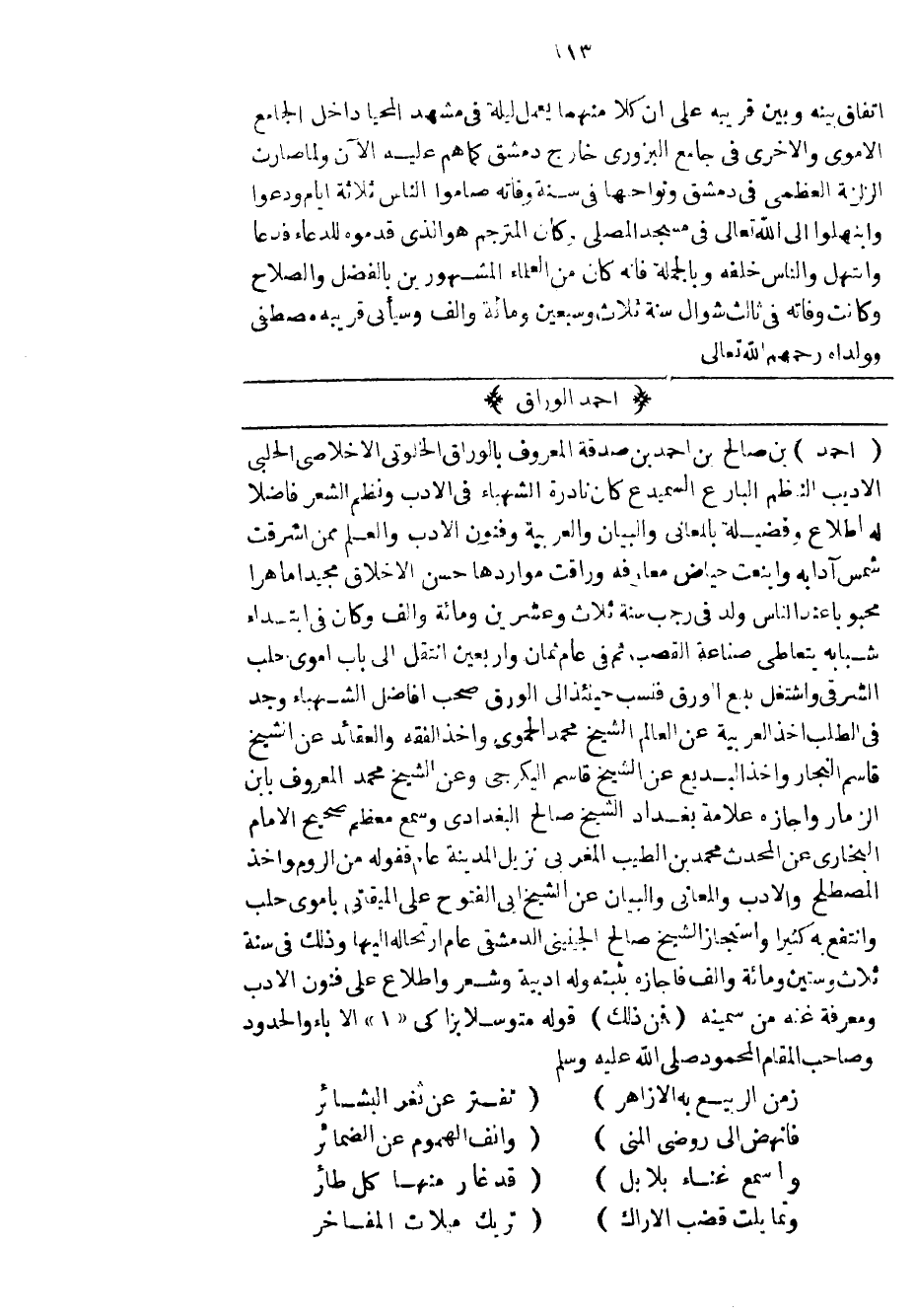 أحمد بن صالح بن أحمد بن صدقة المعروف بالوراق الخلوتي الاخلاصي الحلبي الاديب النظم البارع السميدع كان نادرة الشهباء في الادب ونظم الشعر فاضلاً له اطلاع وفضيلة بالمعاني والبيان والعربية وفنون الادب والعلم ممن اشرقت شمس آدابه واينعت حياض معارفه وراقت مواردها حسن الاخلاق مجيداً ماهراً محبوباً عند الناس ولد في رجب سنة ثلاث وعشرين ومائة والف وكان في ابتداء شبابه يتعاطى صناعة القصب ثم في عام ثمان وأربعين أنتقل إلى باب أموي حلب الشرقي واشتغل ببيع الورق فنسب حينئذ إلى الورق صحب أفاضل الشهباء وجد في الطلب اخذ العربية عن العالم الشيخ محمد الحموي واخذ الفقه والعقائد عن الشيخ قاسم النجار واخذ البديع عن الشيخ قاسم اليكرجي وعن الشيخ محمد المعروف بابن الزمار واجازه علامة بغداد الشيخ صالح البغدادي وسمع معظم صحيح الامام البخاري عن المحدث محمد بن الطيب المغربي نزيل المدينة عام قفوله من الروم واخذ المصطلح والادب والمعاني والبيان عن الشيخ أبي الفتوح علي الميقتي باموي حلب وأنتفع به كثيراً واستجاز الشيخ صالح الجينيني الدمشقي عام ارتحاله اليها وذلك في سنة ثلاث وستين ومائة والف فاجازه بثبته وله ادبية وشعر واطلاع على فنون الادب ومعرفة غنه من سمينه فن ذلك قوله متوسلاً بزاكي الاباء والحدود وصاحب المقام المحمود صلى الله عليه وسلم