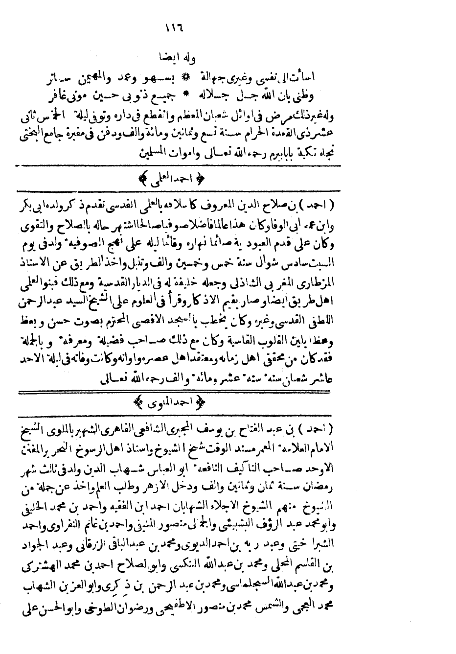 أحمد بن صلاح الدين المعروف كاسلافه بالعلمي القدسي تقدم ذكر ولده أبي بكر وابن عمه أبي الوفا وكان هذا عالماً فاضلاً صوفياً صالحاً اشتهر حاله بالصلاح والتقوى وكان على قدم العبودية صائماً نهاره وقائماً ليله على نهج الصوفية ولد في يوم السبت سادس شوال سنة خمس وخمسين والف وتنبل واخذ الطريق عن الاستاذ المزطاري المغربي الشاذلي وجعله خليفة له في الديار القدسية ومع ذلك فبنوا لعلمي أهل طريق أيضا وصار يقيم الاذكار وقرأ في العلوم على الشيخ السيد عبد الرحمن اللطفي القدسي وغيره وكان يخطب بالسجد الاقصى المحترم بصوت حسن ويعظ وعظاً يلين القلوب القاسية وكان مع ذلك صاحب فضيلة ومعرفة وبالجملة فقد كان من محققي اهل زمانه ومعتقد اهل عصره وأوانه وكأنت وفاته في ليلة الاحد عاشر شعبان سنة ستة عشر ومائة والف رحمه الله تعالى.