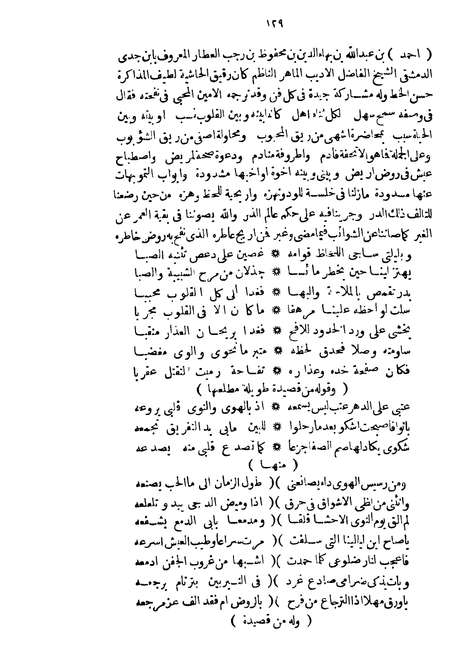 أحمد بن عبد الله بن بهاء الدين بن محفوظ بن رجب العطار المعروف بابن جدي الدمشقي الشيخ الفاضل الأديب الماهر الناظم كان رقيق الحاشية لطيف المذاكرة حسن الخط وله مشاركة جيدة في كل فن وقد ترجمه المين المحبي في نفحته فقال في وصفه سمح سهل لكل ثناء أهل كانما بينه وبين القلوب نسب أو بينه وبين الحياة سبب بمحاضرة أشهى من ريق المحبوب ومحأولة أصفى من ريق الشؤبوب وعلى الجملة فما هو الا تحفة فادم واطروفة منادم ودعوة صحة لمريض واصطباح عيش في روض أريض وبيني وبينه اخوة أو أخيها مشدودة وأبواب التمويهات عنها مسدودة مازلنا في خلسة للود ونهزه وأريحية للحظ وهزه من حين رضعنا للتالف ذلك الدر وجرينا فيه على حكم عالم الذر والله يصوننا في بقية العمر عن الغير كما صاننا عن الشوائب فيما مضى وغبر فمن أريج عاطره الذي نفح به روض خاطره