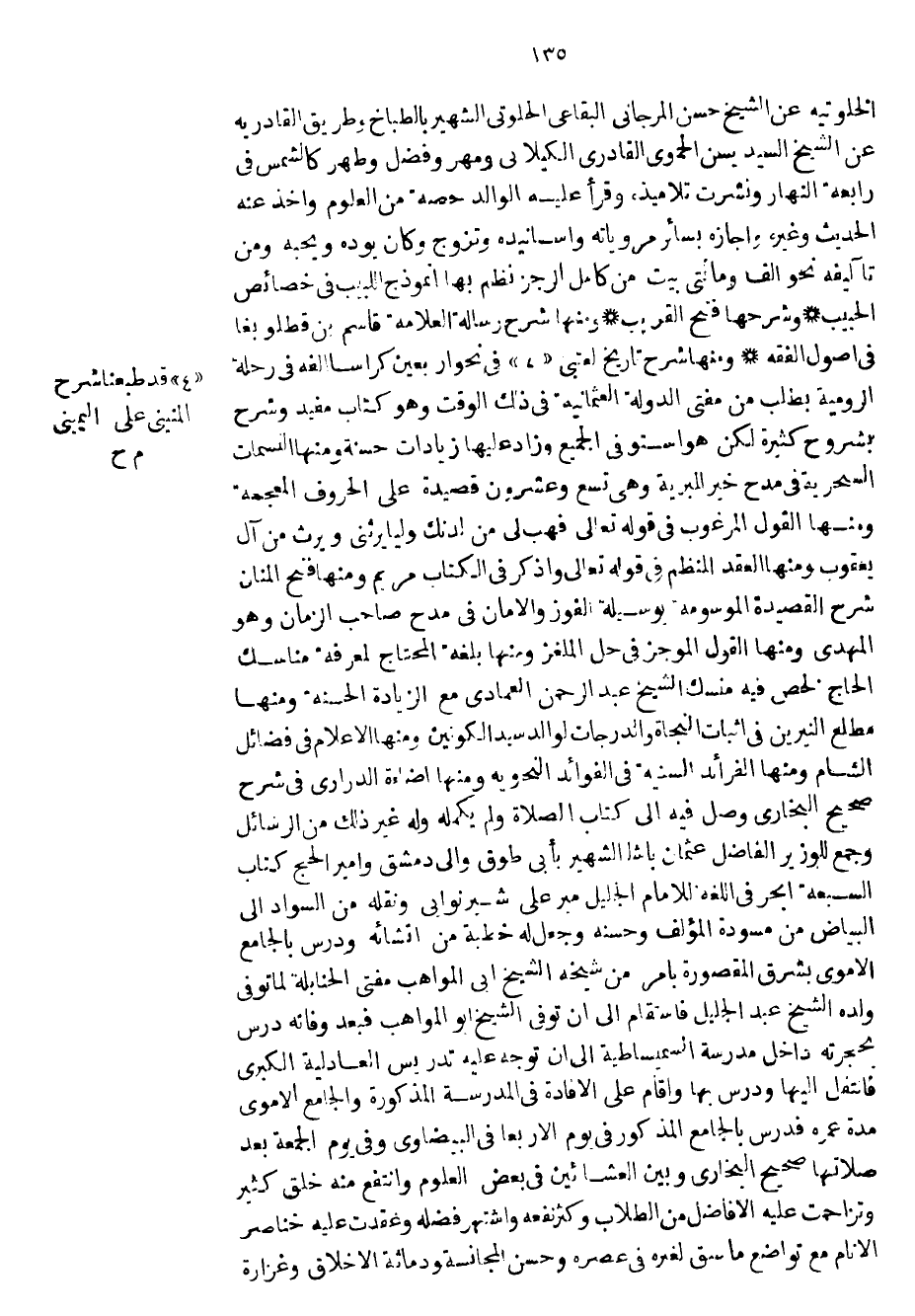 فيه إلى كتاب الصلاة ولم يكمله وله غير ذلك من الرسائل وجمع للوزير الفاضل عثمان باشا الشهير بأبي طوق والي دمشق وأمير الحج كتاب السبعة أبحر في اللغة للامام الجليل مير علي شيرنوأبي ونقله من السواد إلى البياض من مسودة المؤلف وحسنه وجعل له خطبة من انشائه ودرس بالجامع الاموي بشرق المقصورة بأمر من شيخه الشيخ أبي المواهب مفتي الحنابلة لما توفي ولده الشيخ عبد الجليل فاستقام إلى أن توفي الشيخ أبو المواهب فبعد وفاته درس بحجرته داخل مدرسة السميساطية إلى أن توجه عليه تدريس العادلية الكبرى فأنتقل اليها ودرس بها وأقام على الافادة في المدرسة المذكورة والجامع الاموي مدة عمره فدرس بالجامع المذكور في يوم الاربعاء في البيضأوي وفي يوم الجمعة بعد صلاتها صحيح البخاري وبين العشائين في بعض العلوم وأنتفع منه خلق كثير وتزاحمت عليه الأفاضل من الطلاب وكثر نفعه واشتهر فضله وعقدت عليه خناصر الأنام مع تواضع ما سق لغيره في عصره وحسن المجانسة ودماثة الاخلاق وغزارة الفضل والمطارحة اللطيفة ورحل إلى دار الخلافة مرتين وكان ابناؤها يحترمونه وله هناك شهرة بسبب شرحه على تاريخ العتبي المقدم ذكره ورحل إلى الحج مرة وأعطى رتبة السليمانية المتعارفة بين الموالي وصارت عليه تولية السميساطية والعمرية وآخراً صار له قضاء قاراً وأحدث له في الجامع الأموي عشرون عثمانياً وربط عليه خطابة في الجامع المذكور وصار بينه وبين الخطيب محمد سعيد بن أحمد المجانسي المجادلة في ذلك والشقاق وشاعت في وقتها ثم استقر الأمر عليها بعد علاج كثير وقد ترجم المترجم تلميذه الشيخ سعيد السمان في كتابه وقال في وصفه شيخ العلم وفتاه ومن بوجوده ازدان الفضل وتاه أشرق بدراً من افق الهدى تقتبس أنواره وأصبح وهو لمعصم العلى دملجه وسواره فاكتحل به انسان الكمال وتعلقت بذيله من أولى الفضائل الآمال وانقلب به الدهر كله حسنات محمود العواقب في الحركات والسكنات تنهل أساريره بشراً وننفح أردانه نشراً بذكاء لو كان لذكاً لما غيرها الأصيل وأصل في باذخ المجد أصيل وخلق يعلم الحلم الاناءة وشيمة تقابل بالحسنة الاساءة فكم من مغفل فضل أعلمه وكم من مستفيد علم علمه فممن عارفه الا هو أبو عذرتها ولا نادرة الا هو مرهف شفرتها فإذا خاض في مشكل تحقيق حصحص الحق وإذا ابتدر مبحث تدقيق حاز السبق واستحق وإذا ارتقى المنبر سجد له كل مصقع وما تكبر وأما الأدب فهو روضة ذات أفنان الآتي من بدائعه ببدائع أفنان فأساليبه فيه حسنة الانطباع تسوغها الأسماع والطباع وحسبك بمن تأهل للكمالات واعتد من قبل غصن شبيبته يمتد ففاق ببيانه ولسانه وابتهج طرف المعارف بانسانه وتزينة صفحات المهارق بتحريره والتقطت فرائد الفوائد من تقريره وأذعنت لمؤلفاته الصناديد وأودعتها الصدور اشفاقاً عليها من التبديد وكان دخل الروم فتطوقت منه بعقد الثريا واقتدحت من أفكاره زنداً وريا فتلقته رؤساء أعيانها وأحلته منها بسواد أعيانها واقترحت عليه فأجاب بما هو كالصبح المنجاب وقصارى الأمر أنه الفرد الذي عليه المعول والمظهر بمعاني بيانه أسرار الأطول والمطول وهو حدقت عين أساتذتي الذي تحرجت عليه وحبوت للأفادة بين يديه وعطرت أوقاتي بأنفاسه واقتبست نور الأماني من نبراسه وتفيات ظل رعايته عمراً ولم أعص له نهياً ولا أمراً ولي في كل لحظة دعوات أرجو لها الاجابة وتوسلات مقرونة بالضراعة والانابة الا يعتري زهرة أيامه ذبول ولم يبرح لابساً من العمر برداً ضافي الذيول فقد أحلني مكان بنيه ومن يحتوي عليه ويدنيه وهاك من آثاره ما هو أشهى للعيون من الوسن وأفتن للمشجون من الوجه الحسن أنتهى مقاله وكان جدي الشيخ مراد المذكور آنفاً أجل أخصائه ومريديه أخو صاحب الترجمة الشيخ عبد الرحمن المنيني وكان قائماً في أمور جدي بالخدمة وغيرها حتى لما بنى المدرسة المعروفة به في سنة ثمان ومائة وألف جعله ناظراً على العمالين والصناع بها وجعله على أوقافها كاتباً وأمين الكتب وغير ذلك من الوظائف وهي الآن على أولادهم وكذلك جدي والد والدي ووالدي بعده 