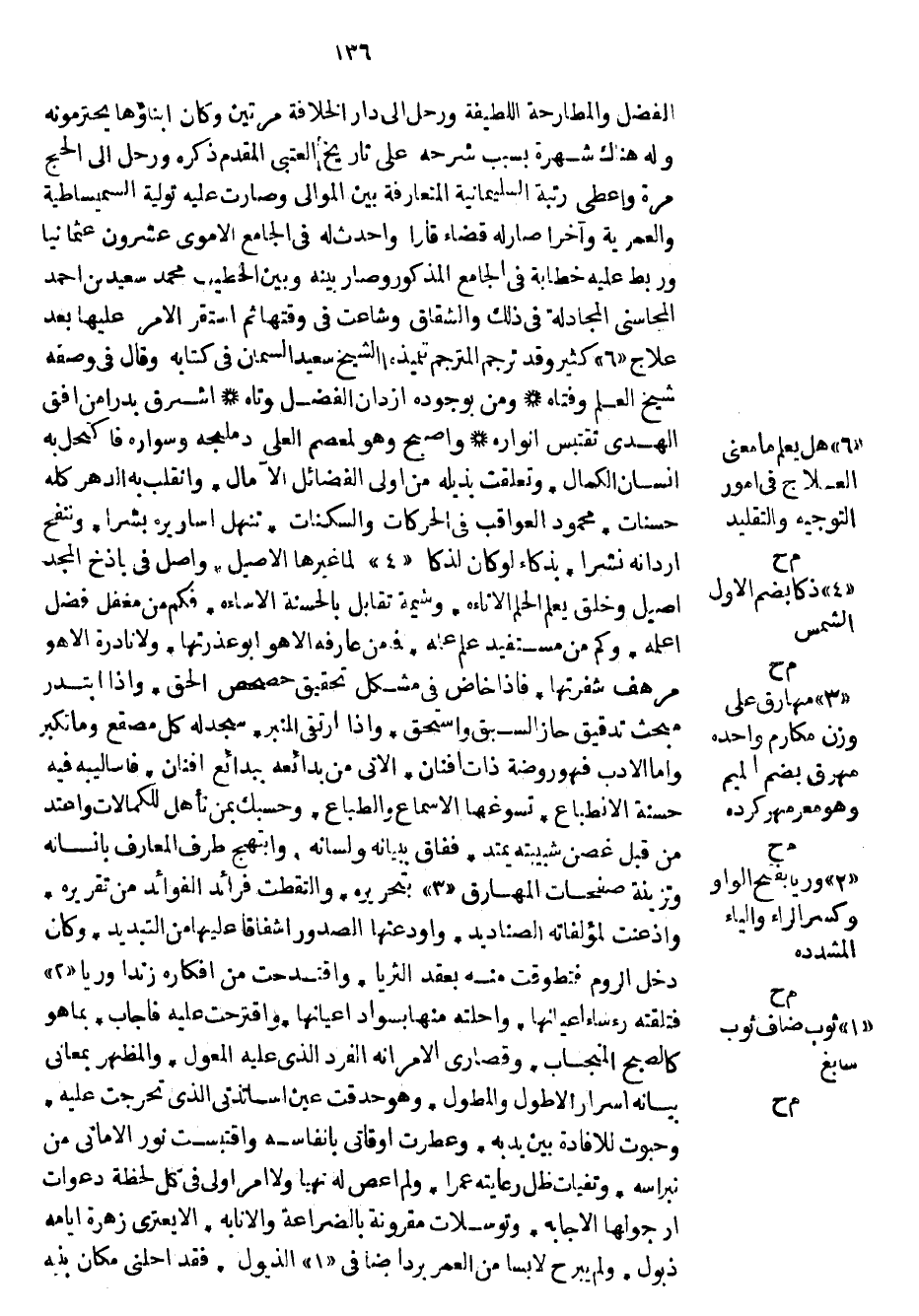 الفضل والمطارحة اللطيفة ورحل إلى دار الخلافة مرتين وكان ابناؤها يحترمونه وله هناك شهرة بسبب شرحه على تاريخ العتبي المقدم ذكره ورحل إلى الحج مرة وأعطى رتبة السليمانية المتعارفة بين الموالي وصارت عليه تولية السميساطية والعمرية وآخراً صار له قضاء قاراً وأحدث له في الجامع الأموي عشرون عثمانياً وربط عليه خطابة في الجامع المذكور وصار بينه وبين الخطيب محمد سعيد بن أحمد المجانسي المجادلة في ذلك والشقاق وشاعت في وقتها ثم استقر الأمر عليها بعد علاج كثير وقد ترجم المترجم تلميذه الشيخ سعيد السمان في كتابه وقال في وصفه شيخ العلم وفتاه ومن بوجوده ازدان الفضل وتاه أشرق بدراً من افق الهدى تقتبس أنواره وأصبح وهو لمعصم العلى دملجه وسواره فاكتحل به انسان الكمال وتعلقت بذيله من أولى الفضائل الآمال وانقلب به الدهر كله حسنات محمود العواقب في الحركات والسكنات تنهل أساريره بشراً وننفح أردانه نشراً بذكاء لو كان لذكاً لما غيرها الأصيل وأصل في باذخ المجد أصيل وخلق يعلم الحلم الاناءة وشيمة تقابل بالحسنة الاساءة فكم من مغفل فضل أعلمه وكم من مستفيد علم علمه فممن عارفه الا هو أبو عذرتها ولا نادرة الا هو مرهف شفرتها فإذا خاض في مشكل تحقيق حصحص الحق وإذا ابتدر مبحث تدقيق حاز السبق واستحق وإذا ارتقى المنبر سجد له كل مصقع وما تكبر وأما الأدب فهو روضة ذات أفنان الآتي من بدائعه ببدائع أفنان فأساليبه فيه حسنة الانطباع تسوغها الأسماع والطباع وحسبك بمن تأهل للكمالات واعتد من قبل غصن شبيبته يمتد ففاق ببيانه ولسانه وابتهج طرف المعارف بانسانه وتزينة صفحات المهارق بتحريره والتقطت فرائد الفوائد من تقريره وأذعنت لمؤلفاته الصناديد وأودعتها الصدور اشفاقاً عليها من التبديد وكان دخل الروم فتطوقت منه بعقد الثريا واقتدحت من أفكاره زنداً وريا فتلقته رؤساء أعيانها وأحلته منها بسواد أعيانها واقترحت عليه فأجاب بما هو كالصبح المنجاب وقصارى الأمر أنه الفرد الذي عليه المعول والمظهر بمعاني بيانه أسرار الأطول والمطول وهو حدقت عين أساتذتي الذي تحرجت عليه وحبوت للأفادة بين يديه وعطرت أوقاتي بأنفاسه واقتبست نور الأماني من نبراسه وتفيات ظل رعايته عمراً ولم أعص له نهياً ولا أمراً ولي في كل لحظة دعوات أرجو لها الاجابة وتوسلات مقرونة بالضراعة والانابة الا يعتري زهرة أيامه ذبول ولم يبرح لابساً من العمر برداً ضافي الذيول فقد أحلني مكان بنيه
