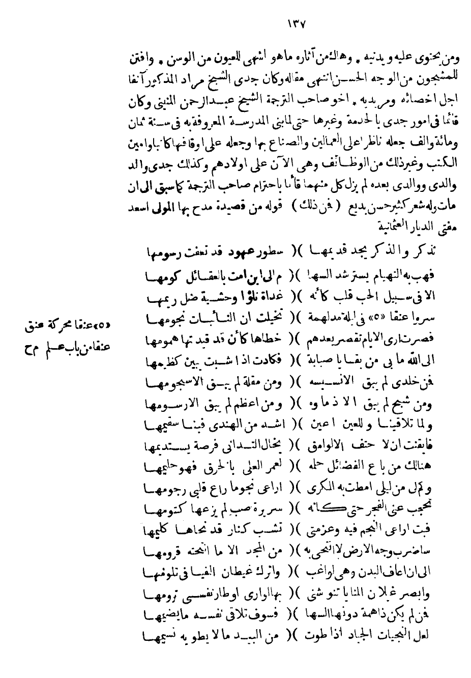 ومن يحتوي عليه ويدنيه وهاك من آثاره ما هو أشهى للعيون من الوسن وأفتن للمشجون من الوجه الحسن أنتهى مقاله وكان جدي الشيخ مراد المذكور آنفاً أجل أخصائه ومريديه أخو صاحب الترجمة الشيخ عبد الرحمن المنيني وكان قائماً في أمور جدي بالخدمة وغيرها حتى لما بنى المدرسة المعروفة به في سنة ثمان ومائة وألف جعله ناظراً على العمالين والصناع بها وجعله على أوقافها كاتباً وأمين الكتب وغير ذلك من الوظائف وهي الآن على أولادهم وكذلك جدي والد والدي ووالدي بعده لم يزل كل منهما قائماً باحترام صاحب الترجمة كما سبق إلى أن مات وله شعر كثير حسن بديع فمن ذلك قوله من قصيدة مدح بها المولى أسعد مفتي الديار العثمانية