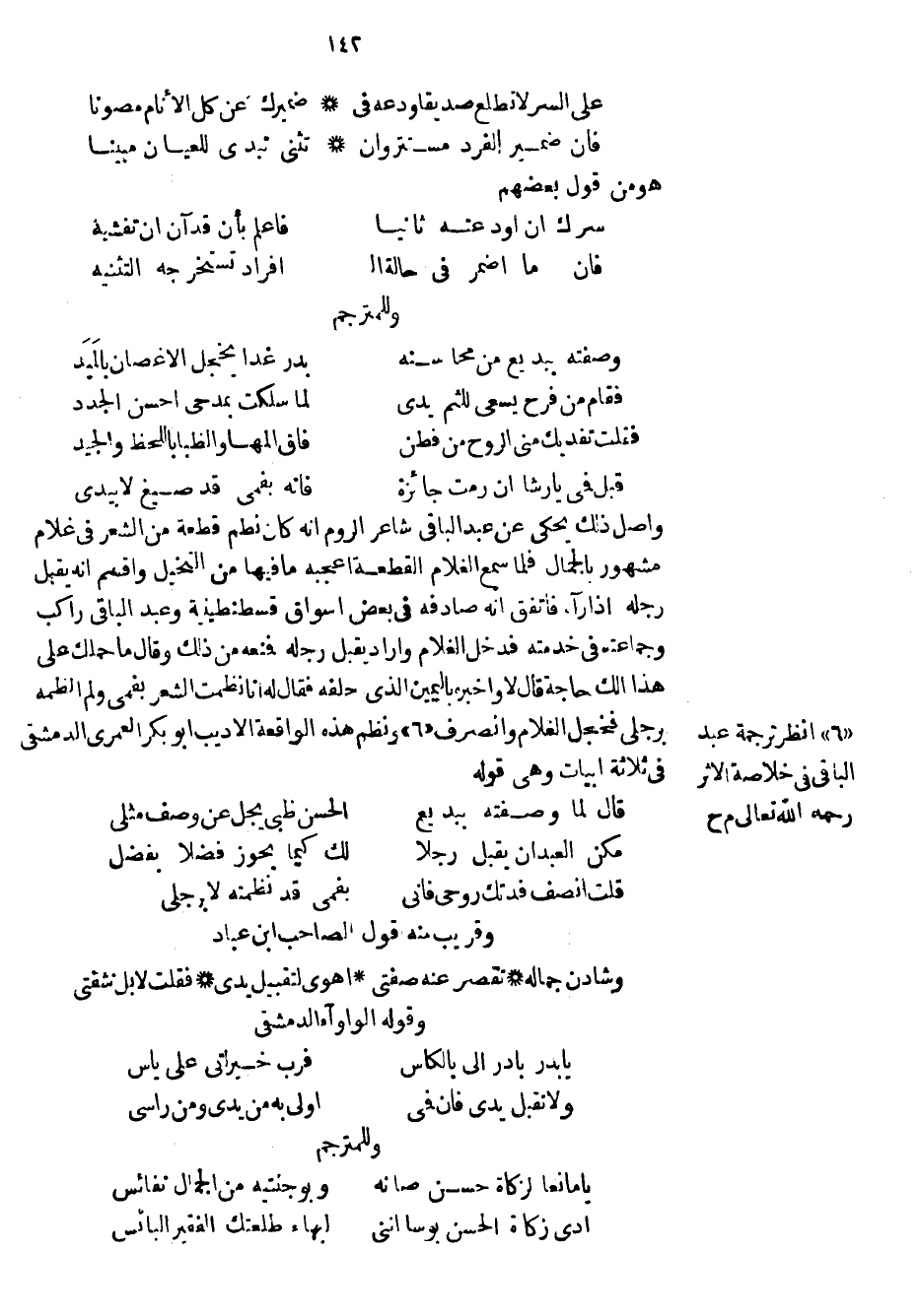 وأصل ذلك يحكي عن عبد الباقي شاعر الروم أنه كان نظم قطعة من الشعر في غلام مشهور بالجمال فلما سمع الغلام القطعة أعجبه ما فيها من التخيل وأقسم أنه يقبل رجله إذا رآه فاتفق انه صادفه في بعض أسواق قسطنطينية وعبد الباقي راكب وجماعته في خدمته فدخل الغلام وأراد يقبل رجله فمنعه من ذلك وقال ما حملك على هذا الك حاجة قال لا وأخبره باليمين الذي حلفه فقال له أنا نظمت الشعر بفمي ولم أنظمه برجلي فخجل الغلام وانصرف ونظم هذه الواقعة الأديب أبو بكر العمري الدمشقي في ثلاثة أبيات وهي قوله