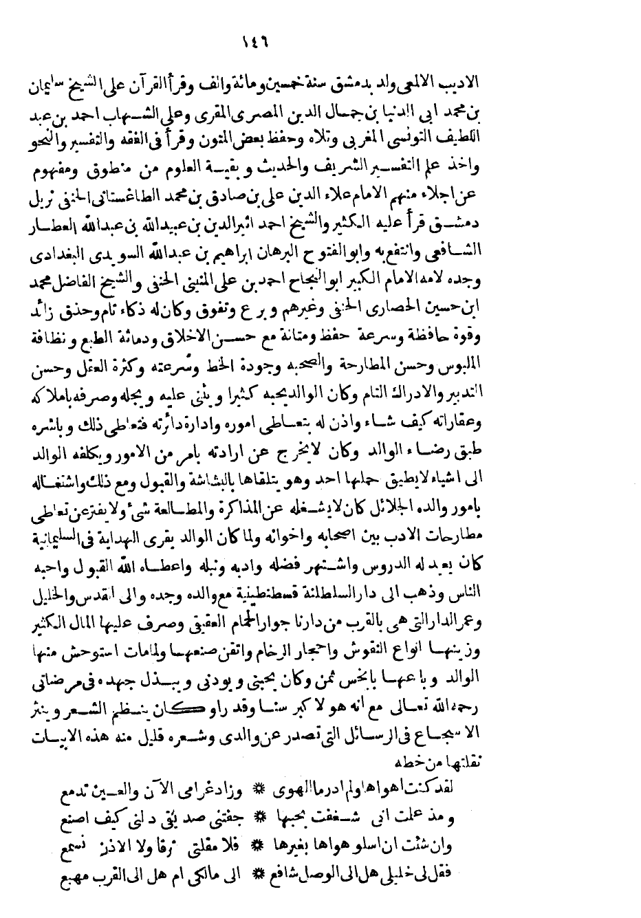 الأديب الألمعي ولد بدمشق سنة خمسين ومائة وألف وقرأ القرآن على الشيخ سليمان بن محمد أبي الدنيا بن جمال الدين المصري المقري وعلى الشهاب أحمد بن عبد اللطيف التونسي المغربي وتلاه وحفظ بعض المتون وقرأ في الفقه والتفسير والنحو وأخذ علم التفسير الشريف والحديث وبقية العلوم من منطوق ومفهوم عن أجلاء منهم الامام علاء الدين علي بن صادق بن محمد الطاغستاني الحنفي تريل دمشق قرأ عليه الكثير والشيخ أحمد أثير الدين بن عبيد الله بن عبد الله العطار الشافعي وأنتفع به وأبو الفتوح البرهان إبراهيم بن عبد الله السويدي البغدادي وجده لأمه الامام الكبير أبو النجاح أحمد بن علي المنيني الحنفي والشيخ الفاضل محمد ابن حسين الحصاري الحنفي وغيرهم وبرع وتفوق وكان له ذكاء تام وحذق زائد وقوة حافظة وسرعة حفظ ومتانة مع حسن الأخلاق ودماثة الطبع ونظافة الملبوس وحسن المطارحة والصحبة وجودة الخط وسرعته وكثرة العقل وحسن التدبير والادراك التام وكان الوالد يحبه كثيراً ويثني عليه ويجله وصرفه بأملاكه وعقاراته كيف شاء وأذن له بتعاطي أموره وادارة دائرته فتعاطى ذلك وباشره طبق رضاء الوالد وكان لا يخرج عن ارادته بأمر من الامور ويكلفه الوالد إلى أشياء لا يطيق حملها أحد وهو يتلقاها بالبشاشة والقبول ومع ذلك واشتغاله بامور والده الجلائل كان لا يشغله عن المذاكرة والمطالعة شيء ولا يفتر عن تعاطي مطارحات الأدب بين أصحابه واخوانه ولما كان الوالد يقري الهداية في السليمانية كان يعيد له الدروس واشتهر فضله وأدبه ونبله واعطاه الله القبول وأحبه الناس وذهب إلى دار السلطنة قسطنطينية مع والده وجده وإلى القدس والخليل وعمر الدار التي هي بالقرب من دارنا جوار الحمام العقيقي وصرف عليها المال الكثير وزينها أنواع النقوش وأحجار الرخام واتقن صنعها ولما مات استوحش منها الوالد وباعها بأبخس ثمن وكان يحبني ويودني ويبذل جهده في مرضاتي رحمه الله تعالى مع أنه هو الاكبر سناً وقد رأو كان ينظم الشعر وينثر الاسجاع في الرسائل التي تصدر عن والدي وشعره قليل منه هذه الأبيات نقلتها من خطه
