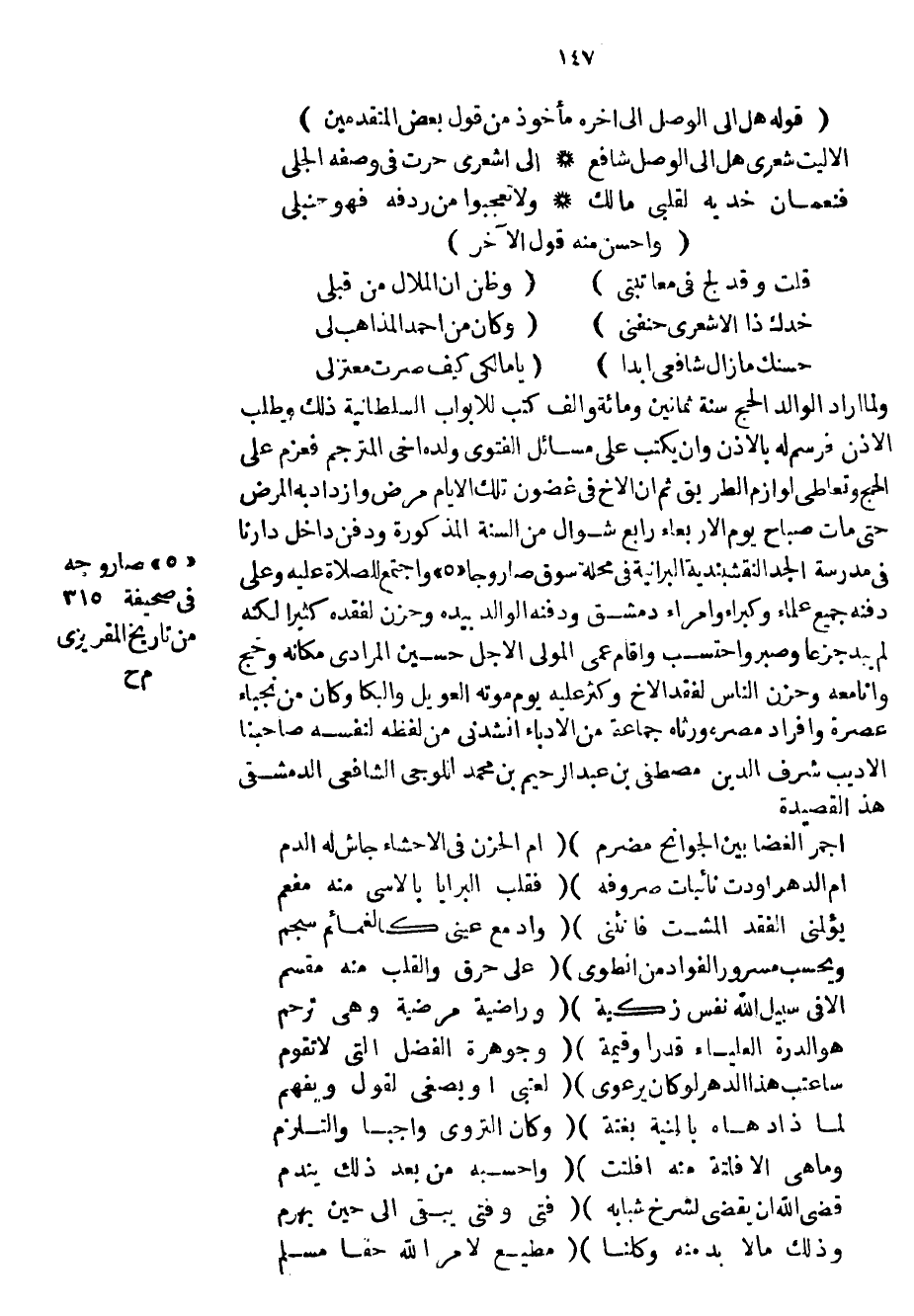ولما أراد الوالد الحج سنة ثمانين ومائة وألف كتب للأبواب السلطانية ذلك وطلب الاذن فرسم له بالاذن وأن يكتب على مسائل الفتوى ولده أخي المترجم فعزم على الحج وتعاطى لوازم الطريق ثم ان الأخ في غضون تلك الأيام مرض وازداد به المرض حتى مات صباح يوم الاربعاء رابع شوال من السنة المذكورة ودفن داخل دارنا في مدرسة الجد النقشبندية البرانية في محلة سوق صاروجا واجتمع للصلاة عليه وعلى دفنه جميع علماء وكبراء وامراء دمشق ودفنه الوالد بيده وحزن لفقده كثيراً لكنه لم يبد جزعاً وصبر واحتسب وأقام عمي المولي الأجل حسين المرادي مكانه وحج وأنا معه وحزن الناس لفقد الأخ وكثر عليه يوم موته العويل والبكا وكان من نجباء عصره وأفراد مصر، ورثاه جماعة من الادباء أنشدني من لفظه لنفسه صاحبنا الأديب شرف الدين مصطفى بن عبد الرحيم بن محمد اللوجي الشافعي الدمشقي هذه القصيدة