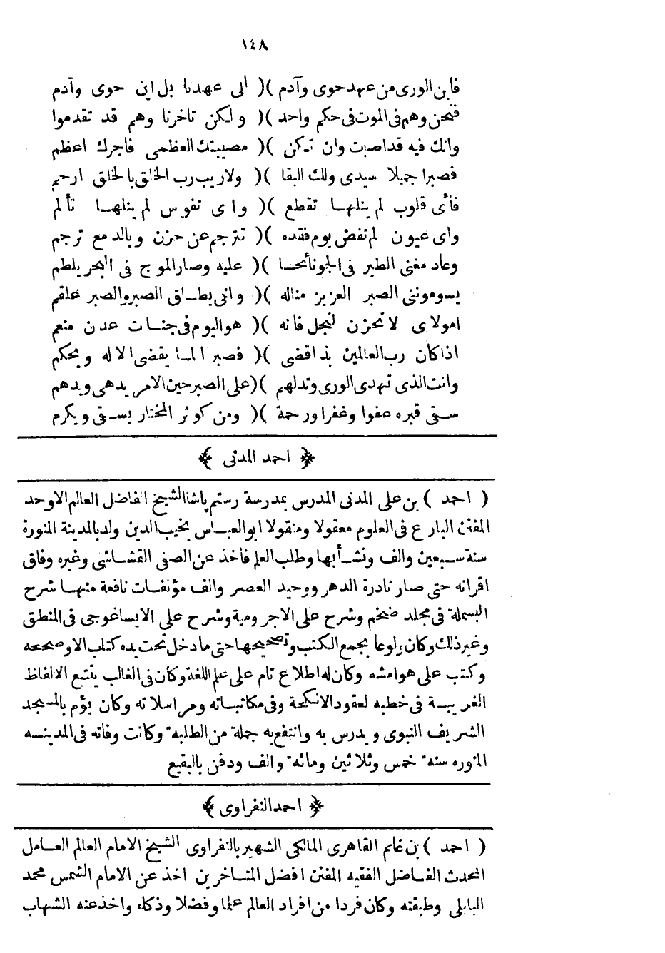 أحمد بن علي المدني المدرس بمدرسة رستم باشا الشيخ الفاضل العالم الأوحد المفنن البارع في العلوم معقولاً ومنقولاً أبو العباس نجيب الدين ولد بالمدينة المنورة سنة سبعين وألف ونشأ بها وطلب العلم فأخذ عن الصفي القشاشي وغيره وفاق أقرانه حتى صار نادرة الدهر ووحيد العصر وألف مؤلفات نافعة منها شرح البسملة في مجلد ضخم وشرح على الاجرومية وشرح على الايساغوجي في المنطق وغير ذلك وكان ولوعاً بجمع الكتب وتصحيحها حتى ما دخل تحت يده كتاب الا وصححه وكتب على هوامشه وكان له اطلاع تام على علم اللغة وكان في الغالب يتتبع الالفاظ الغريبة في خطبه لعقود الانكحة وفي مكاتباته ومراسلاته وكان يؤم بالمسجد الشريف النبوي ويدرس به وأنتفع به جملة من الطلبة وكأنت وفاته في المدينة المنورة سنة خمس وثلاثين ومائة وألف ودفن بالبقيع.