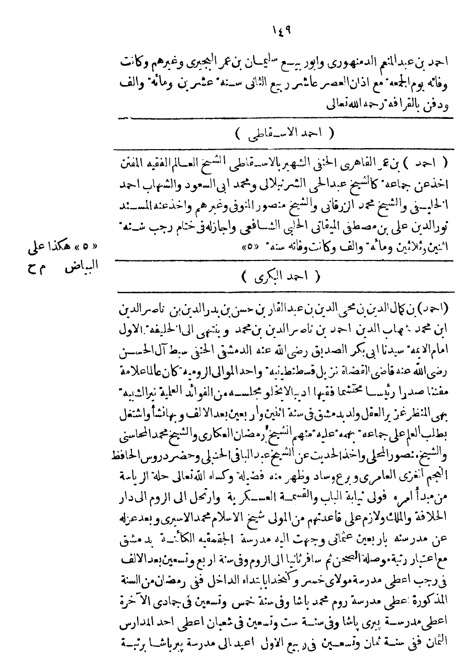 أحمد بن عمر القاهري الحنفي الشهير بالأسقاطي الشيخ العالم الفقيه المفنن أخذ عن جماعة كالشيخ عبد الحي الشرنبلالي ومحمد أبي السعود والشهاب أحمد الخليفي والشيخ محمد الزرقاني والشيخ منصور المنوفي وغيرهم وأخذ عنه المسند نور الدين علي بن مصطفى الميقاتي الحلبي الشافعي وأجاز له في ختام رجب سنة اثنين وثلاثين ومائة وألف وكأنت وفاته سنة 5.