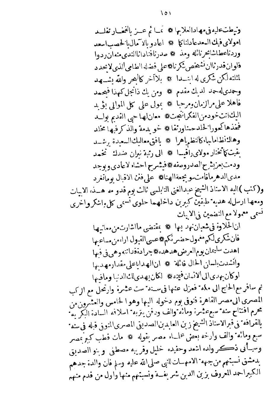 وكتب إليه الاستاذ الشيخ عبد الغني النابلسي ثالث يومق دومه هذه الأبيات ومعها أرسل له هدية طبقين كبيرين داخلهما حلوى تسمى كل واشكر واخرى نسمي معمولاً مع التضمين في الأبيات