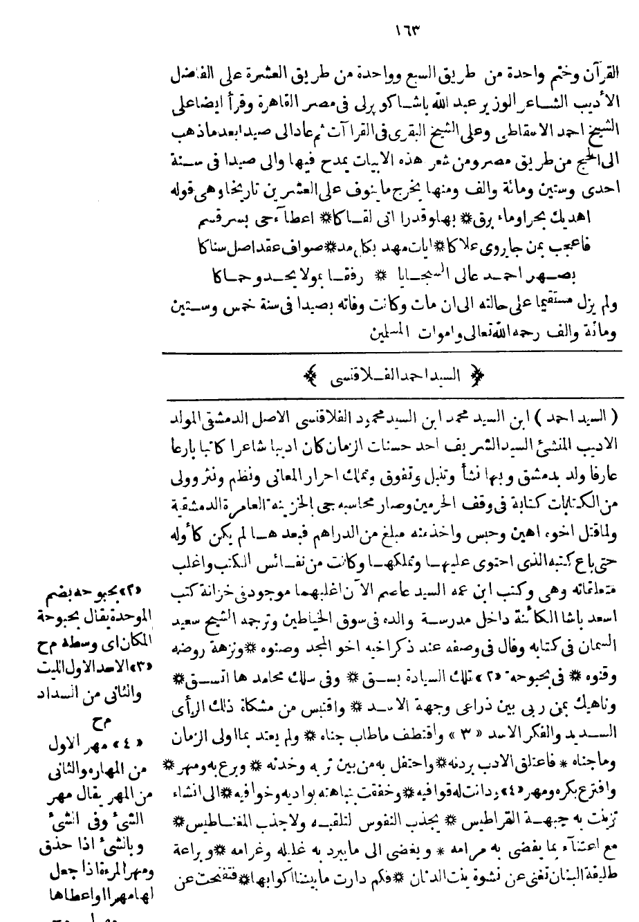 السيد أحمد ابن السيد محمد ابن السيد محمود الفلاقنسي الأصل الدمشقي المولد الأديب المنشئ السيد الشريف أحد حسنات الزمان كان أديباً شاعراً كاتباً بارعاً عارفاً ولد بدمشق وبها نشأ وتذيل وتفوق وتملك أحرار المعاني ونظم ونثر وولي من الكتابات كتابة في وقف الحرمين وصار محاسبه جي بالخزينة العامرة الدمشقية ولما قتل أخوه أهين وحبس وأخذ منه مبلغ من الدراهم فبعدها لم يكن كأوله حتى باع كتبه الذي احتوى عليها وتملكها وكأنت من نفائس الكتب وأغلب متعلقاته وهي وكتب ابن عمه السيد عاصم الآن أغلبهما موجود في خزانة كتب أسعد باشا الكائنة داخل مدرسة والده في سوق الخياطين وترجمه الشيخ سعيد السمان في كتابه وقال في وصفه عند ذكر أخيه أخو المجد وصنوه ونزهة روضه وقنوه في بحبوحة تلك السيادة بسق وفي سلك محامدها اتسق وناهيك بمن ربى بين ذراعي وجهة الأسد واقتبس من مشكاة ذلك الرأي السديد والفكر الأسد واقتطف ما طاب جناه ولم يعتد بما أولى الزمان وما جناه فاعتلق الأدب بردنه واحتفل به من بين تربه وخدته وبرع به ومهر وافترع بكره ومهر ودأنت له قوافيه وخفقت بنباهته بواديه وخوافيه إلى انشاء تزينت به جبهة القراطيس يجذب لانفوس لتلقيه ولا جذب المغناطيس مع اعتناء بما يفضي به مرامه ويغضي إلى ما يبرد به غليله وغرامه وبراعة طليقة البنان تغني عن نشوة بنت الدنان فكم دارت ما بيننا أكوابها فنفخت عن