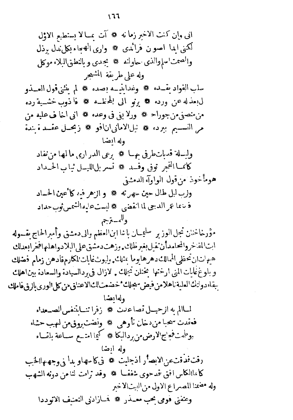 وللمترجم مؤرخاً خنان تجل الوزير سليمان باشا ابن العظم والي دمشق وأمير الحاج بقوله أبت المفاخر والمحامد أن تقيل بغير ظلك وزهت دمشق على البلاد وأهلها فخراً بعدلك هيهات أن تحظى الممالك دهرها يوماً بمثلك وليوث غابات المكارم قادهن زمام فضلك وبلوغ غايات المنى أرختها بختلن نجلك لا زال في برد السيادة والسعادة بين أهلك ببقاء دولتك العلية ناهلاً من فيض سجلك خضعت لك الأعناق من كل الورى بالرق فأملك وله أيضاً