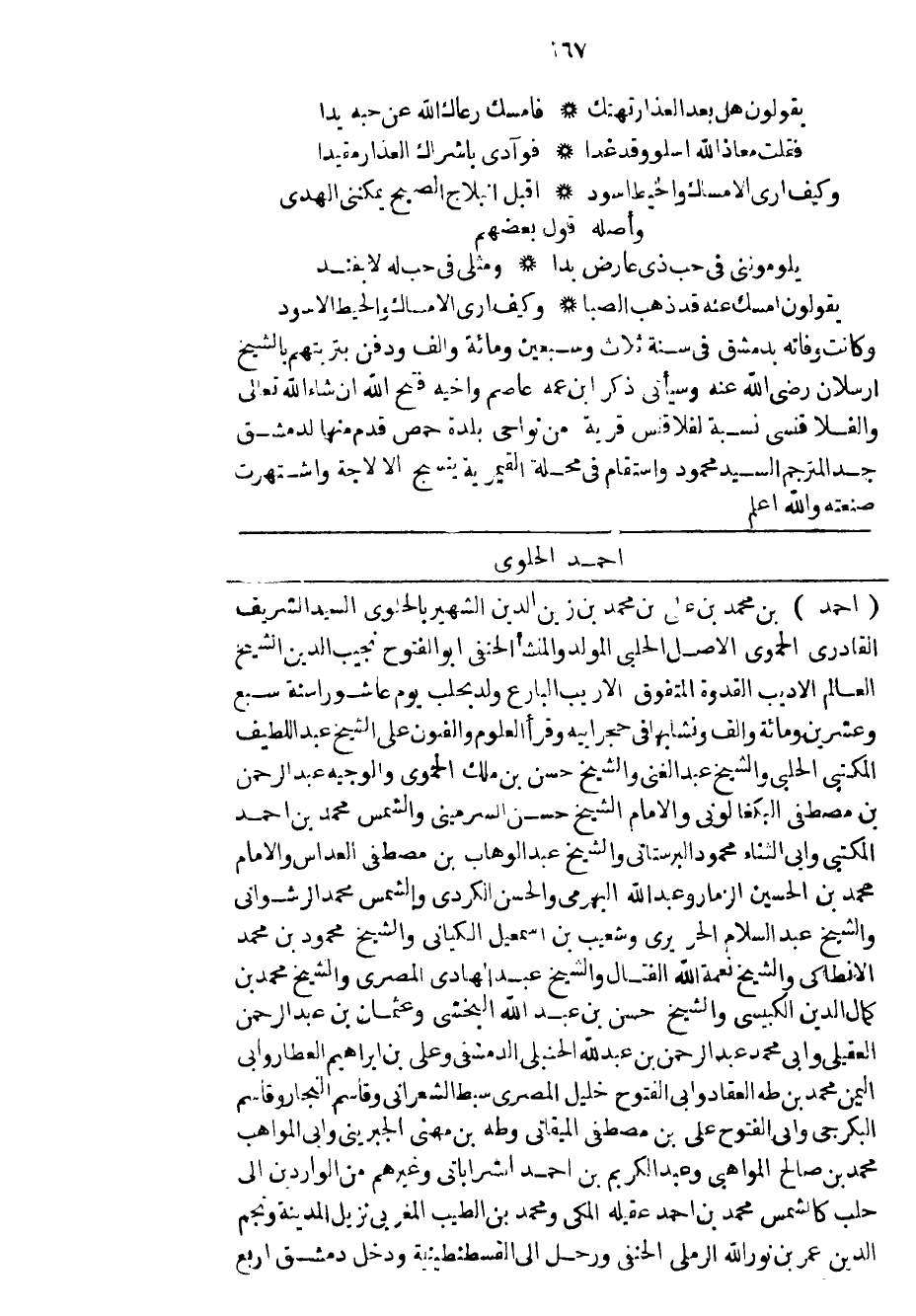 أحمد بن محمد بن علي بن محمد بن زين الدين الشهير بالحلوي السيد الشريف القادري الحموي الأصل الحلبي المولد والمنشأ الحنفي أبو الفتوح نجيب الدين الشيخ العالم الأديب القدوة المتفوق الأريب البارع ولد بحلب يوم عاشورا سنة سبع وعشرين ومائة وألف ونشابها في حجر أبيه وقرأ العلوم والفنون على الشيخ عبد اللطيف المكتبي الحلبي والشيخ عبد الغني والشيخ حسن بن ملك الحموي والوجيه عبد الرحمن بن مصطفى البكغالوني والامام الشيخ حسن السرميني والشمس محمد بن أحمد المكتبي وأبي الثناء محمود البرستاني والشيخ عبد الوهاب بن مصطفى العداس والامام محمد بن الحسين الزمار وعبد الله البهرمي والحسن الكردي والشمس محمد الرشواني والشيخ عبد السلام الحريري وشعيب بن إسماعيل الكياني والشيخ محمود بن محمد الانطاكي والشيخ نعمة الله الفتال والشيخ عبد الهادي المصري والشيخ محمد بن كمال الدين الكبيسي والشيخ حسن بن عبد الله البخشي وعثمان بن عبد الرحمن العقيلي وأبي محمد عبد الرحمن بن عبد الله الحنبلي الدمشقي وعلي بن إبراهيم العطار وأبي اليمن محمد بن طه العقاد وأبي الفتوح خليل المصري سبط الشعراني وقاسم النجار وقاسم البكرجي وأبي الفتوح علي بن مصطفى الميقاتي وطه بن مهني الجبريني وأبي المواهب محمد بن صالح المواهبي وعبد الكريم بن أحمد الشراباتي وغيرهم من الواردين إلى حلب كالشمس محمد بن أحمد عقيله المكي ومحمد بن الطيب المغربي نزيل المدينة ونجم الدين عمر بن نور الله الرملي الحنفي ورحل إلى القسطنطينية ودخل دمشق أربع