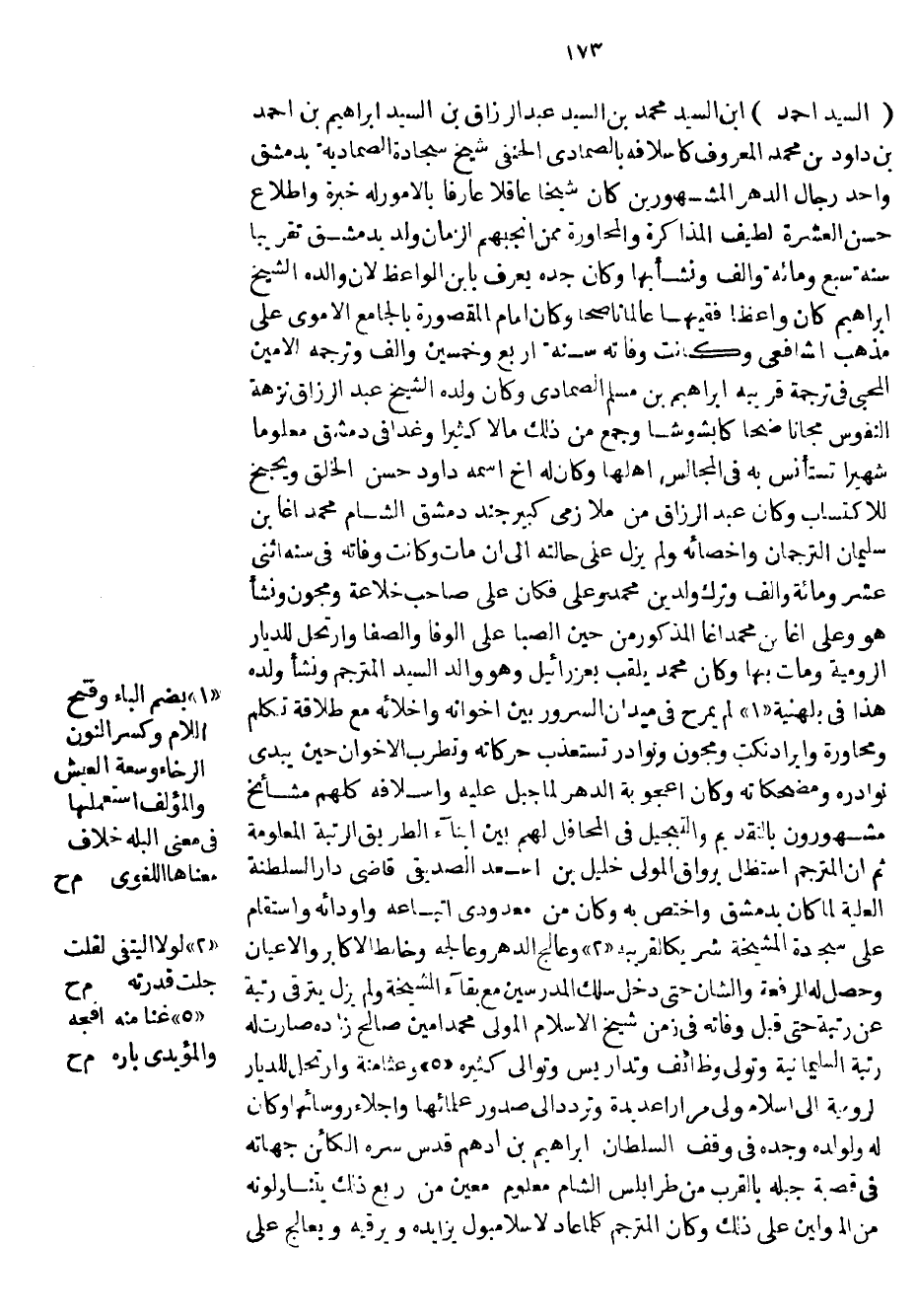 السيد أحمد ابن السيد محمد بن السيد عبد الرزاق بن السيد إبراهيم بن أحمد بن دأود بن محمد المعروف كأسلافه بالصمادي الحنفي شيخ سجادة الصمادية بدمشق وأحد رجال الدهر المشهورين كان شيخاً عاقلاً عارفاً بالأمور له خبرة واطلاع حسن العشرة لطيف المذاكرة والمحأورة ممن أنجبهم الزمان ولد بدمشق تقريباً سنة سبع ومائة وألف ونشأ بها وكان جده يعرف بابن الواعظ لأن والده الشيخ إبراهيم كان واعظاً فقيهاً عالماً ناصحاً وكان امام المقصورة بالجامع الأموي على مذهب الشافعي وكأنت وفاته سنة أربع وخمسين وألف وترجمه الأمين المحبي في ترجمة قريبه إبراهيم بن مسلم الصمادي وكان ولده الشيخ عبد الرزاق نزهة النفوس مجاناً ضحاكاً بشوشاً وجمع من ذلك مالاً كثيراً وغدا في دمشق معلوماً شهيراً تستأنس به في المجالس أهلها وكان له أخ اسمه دأود حسن الخلق ويجخ للاكتساب وكان عبد الرزاق من ملازمي كبير جند دمشق الشام محمد أغا بن سليمان الترجمان واخصائه ولم يزل على حالته إلى أن مات وكأنت وفاته في سنة اثني عشر ومائة وألف وترك ولدين محمد وعلي فكان علي صاحب خلاعة ومجون ونشأ هو وعلي أغا بن محمد أغا المذكور من حين الصبا على الوفا والصفا وارتحل للديار الرومية ومات بها وكان محمد يلقب بعزرائيل وهو والد السيد المترجم ونشأ ولده هذا في بلهنية لم يمرح في ميدان السرور بين اخوانه واخلائه مع طلاقة تكلم ومحأورة وايراد نكب ومجون ونوادر تستعذب حركاته وتطرب الاخوان حين يبدي نوادره ومضحكاته وكان اعجوبة الدهر لما جبل عليه وأسلافه كلهم مشائخ مشهورون بالتقديم والتبجيل في المحافل لهم بين ابناء الطريق الرتبة المعلومة ثم ان المترجم استظل برواق المولى خليل بن أسعد الصديقي قاضي دار السلطنة العلية لما كان بدمشق واختص به وكان من معدودي أتباعه وأودائه واستقام على سجدة المشيخة شريكاً لقريبه وعالج الدهر وعالجه وخالط الاكابر والاعيان وحصل له الرفعة والشأن حتى دخل سلك المدرسين مع بقاء المشيخة ولم يزل يترقى رتبة عن رتبة حتى قبل وفاته في زمن شيخ الاسلام المولى محمد أمين صالح زاده صارت له رتبة السليمانية وتولى وظائف وتداريس وتوالى كثيرة وعثامنة وارتحل للديار لروية إلى اسلام ولي مراراً عديدة وتردد إلى صدور علمائها وأجلاء رؤسائها وكان له ولولده وجده في وقف السلطان إبراهيم بن أدهم قدس سره الكائن جهاته في قصبة جبله بالقرب من طرابلس الشام معلوم معين من ربع ذلك يتنأولونه من المولين على ذلك وكان المترجم كلما عاد لاسلامبول يزايده ويرقيه ويعالج على