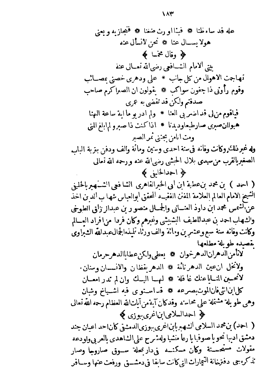 وله غير ذلك وكأنت وفاته في سنة احدى وستين ومائة وألف ودفن بتربة الباب الصغير بالقرب من سيدي بلال الحبشي رضي الله عنه ورحمه الله تعالى.