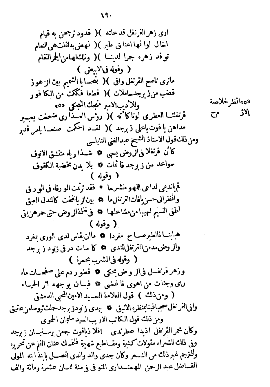 ومن ذلك قول الكاتب الاريب السيد سليمان الحموي وكان محمر القرنفل اذ بدا عطر ندى أفلاذ ياقوت جمعن برستبان زبرجد وفي ذلك للشعراء مقولات كثيرة ومقاطيع شهيرة فلنمسك عنان القلم عن تحريره وللمترجم غير ذلك من الشعر وكان جدي والد والدي اتصل بابنة ابنه المولى الفاضل عبد الرحمن المهمنداري المتوفي في سنة ثمان عشرة ومائة وألف