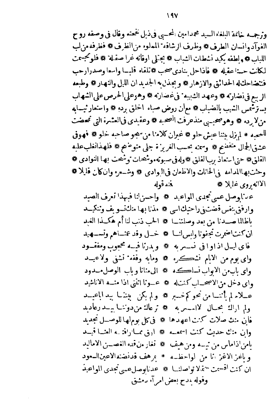 وترجمه خاتمة البلغاء السيد محمد أمين المحبي في ذيل نفحته وقال في وصفه روح الفؤاد وانسان الطرف وظرف الرشاقة المملوء من الظرف فظرفه من لب اللباب ولطفه يكيد نشطات الشباب يجتلي أوقاته غرا صقلة فلو تجسمت لكأنت حسناً عقيله فإذا حل بنادي صحب تلقاه قلباً واسعاً وصدراً رحب فتتضاحك له الحدائق والأزهار ويجذل به الجديد ان الليل والنهار وطبعه الربيع في نضارته وعهد الشبيبة في غضارته وهو على الحرص على الشهاب يستر شمس الشيب بالضباب مع أن روض صباه أخلق برده واستعار ثيابه من لا يرده وهو صحيبي منذ عرفت الصحبة وعقيدي في العشرة التي تمحضت للمحبة لم يزل بيتنا عيش حلو غير أن كلامنا من سجو صاحبه خلو فهو في عشق الجمال متفضح وسمته بحسب الغريزة جلي متوضح فلهذا تغلب عليه القلق حتى استعاذ برب القلق وله في صبوته موشحات وشحت بها النوادي وحثت بها المدامة في الحانات والاظعان في البوادي وشعره وان كان قليلاً الا أنه يروي غليلاً فمنه قوله
