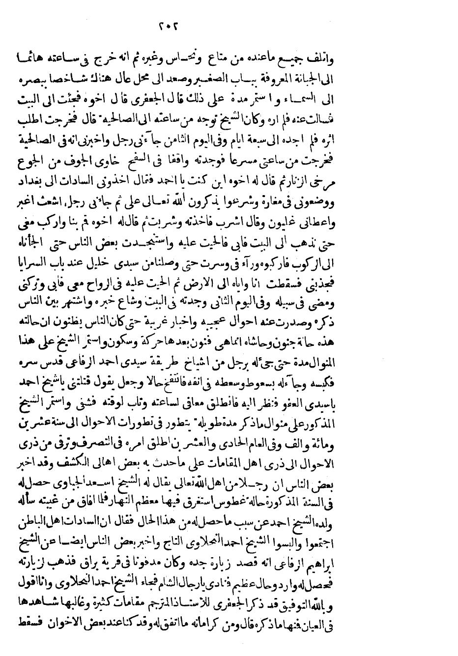 وأتلف جميع ما عنده من متاع ونحاس وغيره ثم أنه خرج في ساعته هائماً إلى الجبانة المعروفة بباب الصغير وصعد إلى محل عال هناك شاخصاً ببصره إلى السماء واستمر مدة على ذلك قال الجعفري قال أخوه فجئت إلى البيت فسألت عنه فلم أره وكان الشيخ توجه من ساعته إلى الصالحية قال فخرجت أطلب أثره فلم أجده إلى سبعة أيام وفي اليوم الثامن جاءني رجل وأخبرني أنه في الصالحية فخرجت من ساعتي مسرعاً فوجدته واقفاً في السفح خأوي الجوف من الجوع مرخى الزنار ثم قال له أخوه أين كنت يا أحمد فقال أخذوني السادات إلى بغداد ووضعوني في مغارة وشرعوا يذكرون الله تعالى علي ثم جاءني رجل أشعث أغبر وأعطاني غليون وقال أشرب فأخذته وشربت ثم قال له أخوه قم بنا واركب معي حتى نذهب إلى البيت فأبى فألحيت عليه واستنجدت بعض الناس حتى الجأناه إلى الركوب فأركبوه وراء في وسرت حتى وصلنا من سيدي خليل عند باب السرايا فجذبني فسقطت أنا واياه إلى الأرض ثم ألحيت عليه في الرواح معي فأبى وتركني ومضى في سبيله وفي اليوم الثاني وجدته في البيت وشاع خبره واشتهر بين الناس ذكره وصدرت عنه أحوال عجيبة وأخبار غريبة حتى كان الناس يظنون أن حالته هذه حالة جنون وحاشاه انما هي فنون بعدها حركة وسكون واستمر الشيخ على هذا المنوال مدة حتى جئ له برجل من أشياخ طريقة سيدي أحمد الرفاعي قدس سره فكبسه وجاء له بسعوط وسعطه في أنفه فأنتفخ حالاً وجعل يقول قتلتني يا شيخ أحمد يا سيدي العفو فنظر إليه فانطلق معافى لساعته وتاب لوقته فشفى واستمر الشيخ المذكور على منوال ما ذكر مدة طويلة يتطور في تطورات الأحوال إلى سنة عشرين ومائة وألف وفي العام الحادي والعشرين أطلق أمره في التصرف وترقى من ذرى الأحوال إلى ذرى أهل المقامات على ما حدث به بعض أهالي الكشف وقد أخبر بعض الناس أن رجلاً من أهل الله تعالى يقال له الشيخ أسعد الجبأوي حصل له في السنة المذكورة حالة غطوس استغرق فيها معظم النهار فلما أفاق من غيبته سأله ولده الشيخ أحمد عن سبب ما حصل له من هذا الحال فقال ان السادات أهل الباطن اجتمعوا وألبسوا الشيخ أحمد النحلأوي التاج وأخبر بعض الناس أيضاً عن الشيخ إبراهيم الرفاعي أنه قصد زيارة جده وكان مدفوناً في قرية براق فذهب لزيارته فحصل له وارد وحال عظيم فنادى يا رجال الشام فجاء الشيخ أحمد النحلأوي وأنا أقول وبالله التوفيق قد ذكر الجعفري للأستاذ المترجم مقامات كثيرة وغالبها شاهدها في العيان فمنها ما ذكره قال ومن كراماته ما اتفق له وقد كنا عند بعض الاخوان فسقط