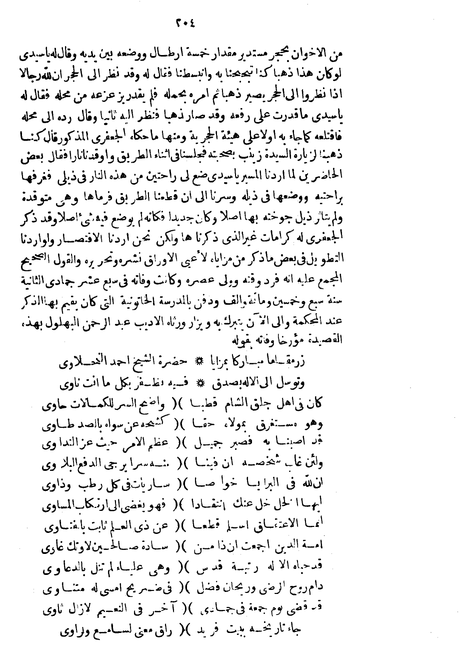 من الاخوان بحجر مستدير مقدار خمسة أرطال ووضعه بين يديه وقال له يا سيدي لو كان هذا ذهباً كنا تججنا به وانبسطنا فقال له وقد نظر إلى الحجران لله رجالاً إذا نظروا إلى الحجر يصير ذهباً ثم أمره بحمله فلم يقدر يزعزعه من محله فقال له يا سيدي ما قدرت على رفعه وقد صار ذهباً فنظر إليه ثانياً وقال رده إلى محله فاقتلعه كما جاء به أولاً على هيئة الحجرية ومنها ما حكاه الجعفري المذكور قال كنا ذهبنا لزيارة السيدة زينب بصحبته فجلسنا في أثناء الطريق وأوقدنا ناراً فقال بعض الحاضرين لما أردنا المسير يا سيدي ضع لي راحتين من هذه النار في ذيلي فغرفها براحتيه ووضعها في ذيله وسرنا إلى أن قطعنا الطريق فرماها وهي متوقدة ولم يتأثر ذيل جوخته بها أصلاً وكان جديداً فكأنه لم يوضع فيه شيء أصلاً وقد ذكر الجعفري له كرامات غير الذي ذكرناها ولكن نحن أردنا الاقتصار ولو أردنا التطويل في بعض ما ذكر من مزاياه لأعيي الأوراق نشره وتحريره والقول الصحيح المجمع عليه أنه فرد وقته وولي عصره وكأنت وفاته في سبع عشر جمادي الثانية سنة سبع وخمسين ومائة وألف ودفن بالمدرسة الخاتونية التي كان يقيم بها الذكر عند المحكمة وإلى الآن يتبرك به ويزار ورثاه الأديب عبد الرحمن البهلول بهذه القصيدة مؤخراً وفاته بقوله