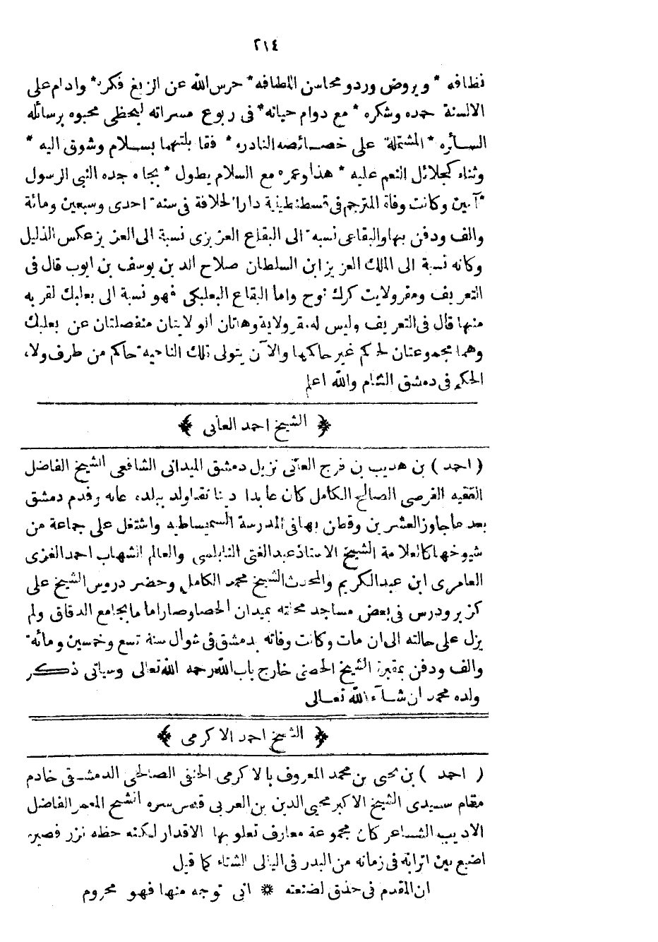 أحمد بن يحيى بن محمد المعروف بالأكرمي الحنفي الصالحي الدمشقي خادم مقام سيدي الشيخ الأكبر محيي الدين بن العربي قيس سره انشح المعمر الفاضل الأديب الشاعر كان مجموعة معارف تعلو بها الأقدار لكنه حظه نزر فصيره اضبع بين أترابه في زمانه من البدر في اليالي الشتاء كما قيل