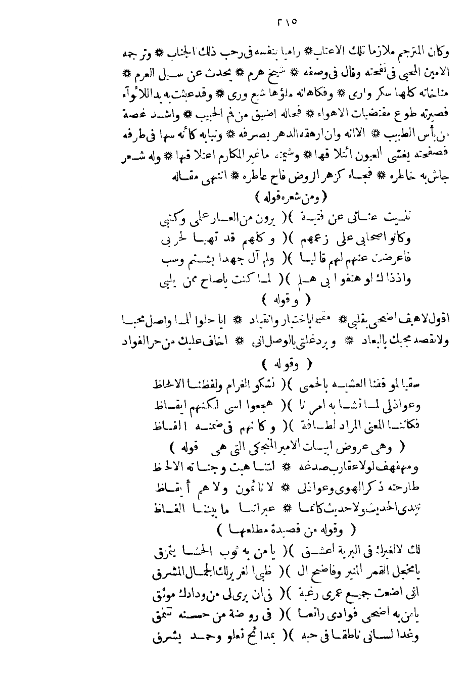 وكان المترجم ملازماً تلك العتاب رامياً بنفسه في رحب ذلك الجناب وترجمه الأمين المحبي في نفحته وقال في وصفه شيخ هرم يحدث عن سيل العرم مناخاته كلها سكر وأرى وفكاهاته ملؤها شبع ورى وقد عبثت به يد اللأواء فصيرته طوع مقتضيات الأهواء فحاله أضيق من فم الحبيب وأشد غصة من بأس الطبيب الا أنه وان أرهقه الدهر بصرفه ونبا به كأنه سها في طرفه فصفحته يغشي العيون ائتلاقها وشيمته ما غير المكارم اعتلاقها وله شعر جاش به خاطره فجاء كزهر الروض فاح عاطره أنتهى مقاله
