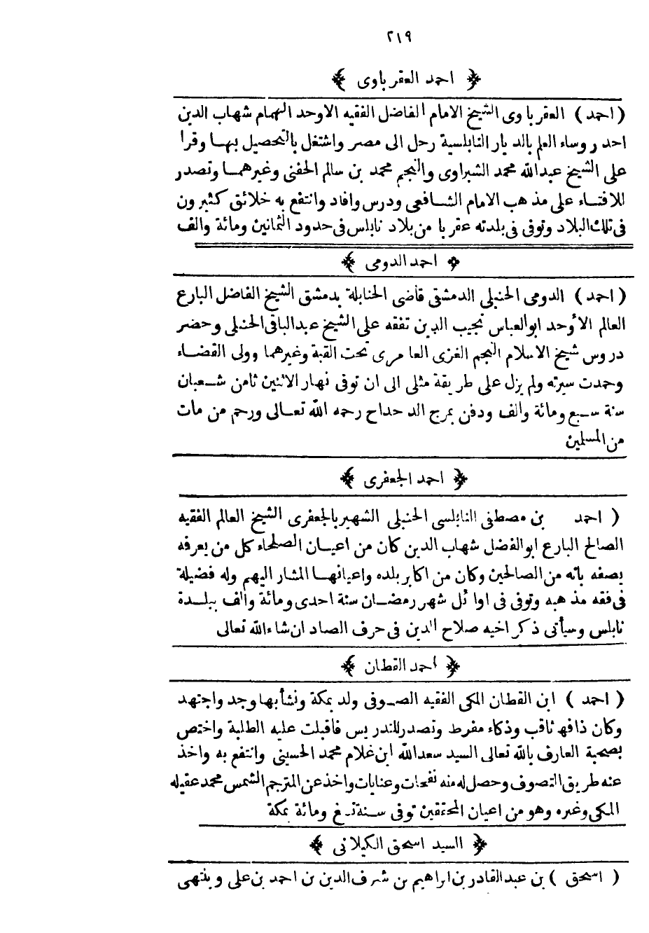 أحمد العقربأوي الشيخ الامام الفاضل الفقيه الأوحد الهمام شهاب الدين أحد رؤساء العلم بالديار النابلسية رحل إلى مصر واشتغل بالتحصيل بها وقرا على الشيخ عبد الله محمد الشبرأوي والنجم محمد بن سالم الحفني وغيرهما وتصدر للأفتاء على مذهب الامام الشافعي ودرس وأفاد وأنتفع به خلائق كثيرون في تلك البلاد وتوفي في بلدته عقرباً من بلاد نابلس في حدود الثمانين ومائة وألف