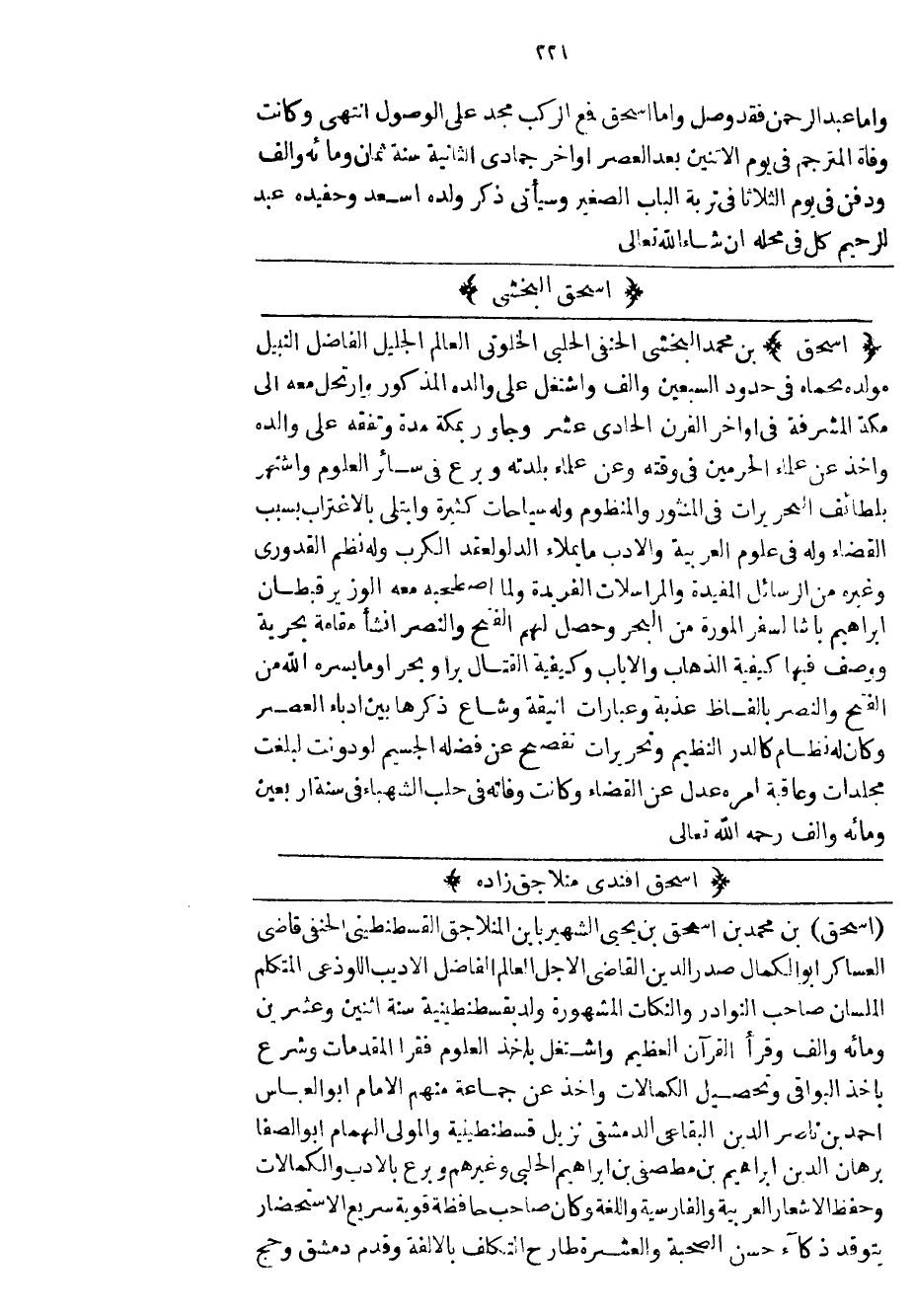 اسحق بن محمد البخشي الحنفي الحلبي الخلوتي العالم الجليل الفاضل النبيل مولده بحماه في حدود السبعين وألف واشتغل على والده المذكور وارتحل معه إلى مكة المشرفة في أواخر القرن الحادي عشر وجأور بمكة مدة وتفقه على والده وأخذ عن علماء الحرمين في وقته وعن علماء بلدته وبرع في سائر العلوم واشتهر بلطائف التحريرات في المنثور والمنظوم وله سياحات كثيرة وابتلى بالاغتراب بسبب القضاء وله في علوم العربية والأدب ما يملأ الدلو لعقد الكرب وله نظم القدوري وغيره من الرسائل المفيدة والمراسلات الفريدة ولما اصطحبه معه الوزير قبطان إبراهيم باشا لسفر المورة من البحر وحصل لهم الفتح والنصر انشأ مقامة بحرية ووصف فيها كيفية الذهاب والاياب وكيفية القتال براً وبحراً وما يسره الله من الفتح والنصر بألفاظ عذبة وعبارات أنيقة وشاع ذكرها بين ادباء العصر وكان له نظام كالدر النظيم وتحريرات تفصح عن فضله الجسيم لو دونت لبلغت مجلدات وعاقبة أمره عدل عن القضاء وكأنت وفاته في حلب الشهباء في سنة أربعين ومائة وألف رحمه الله تعالى.